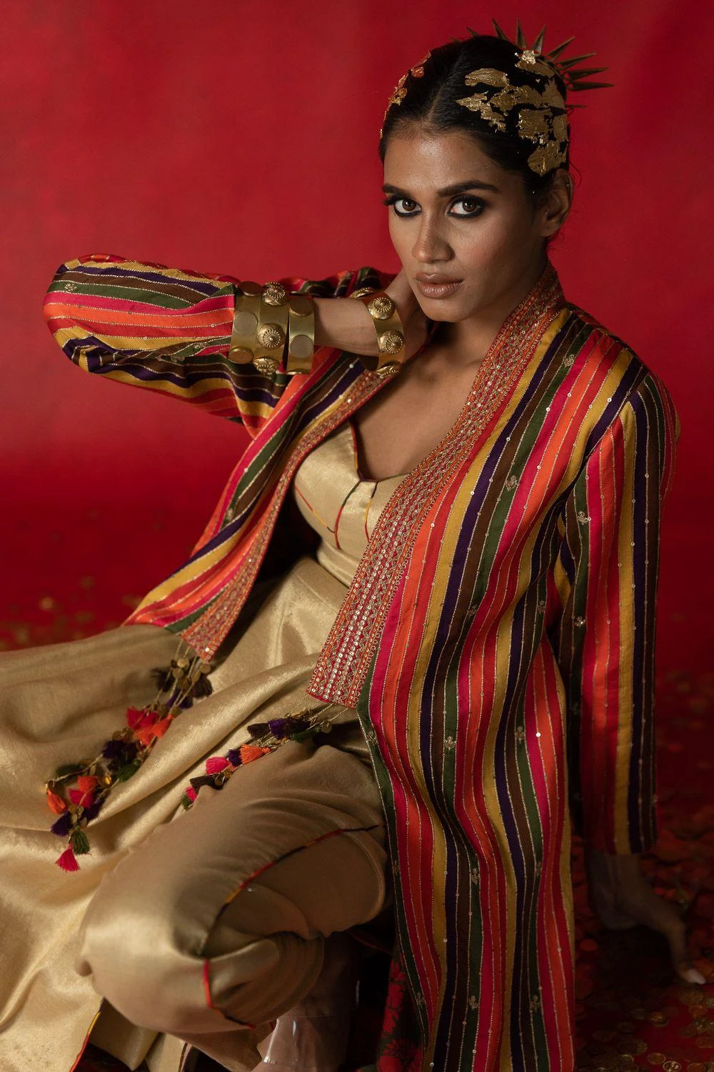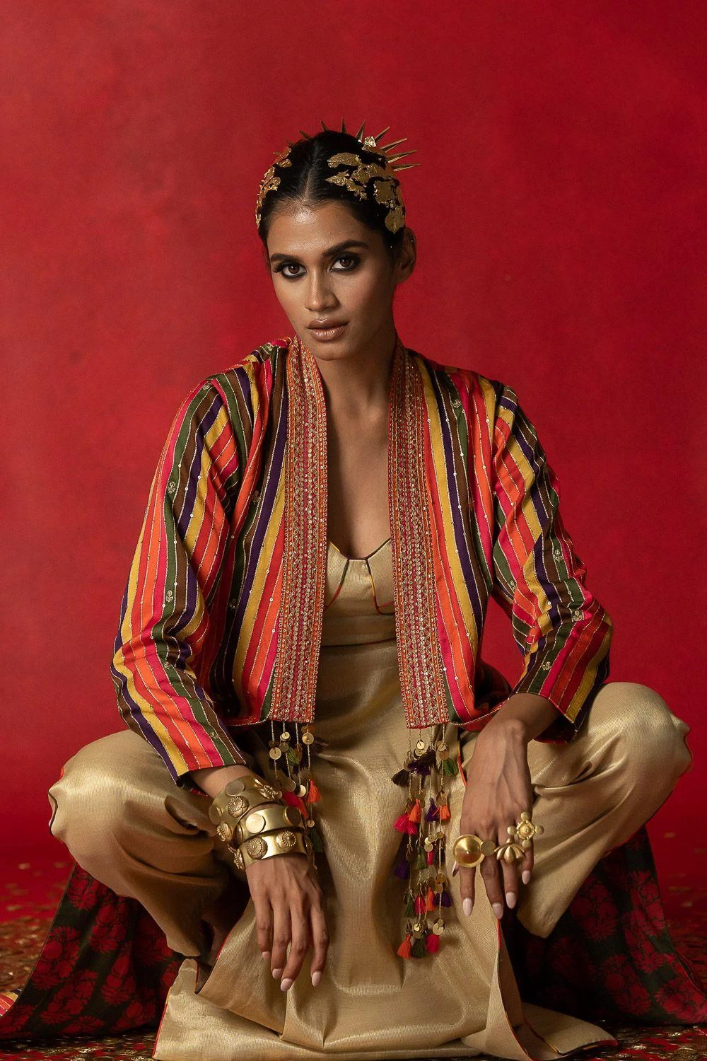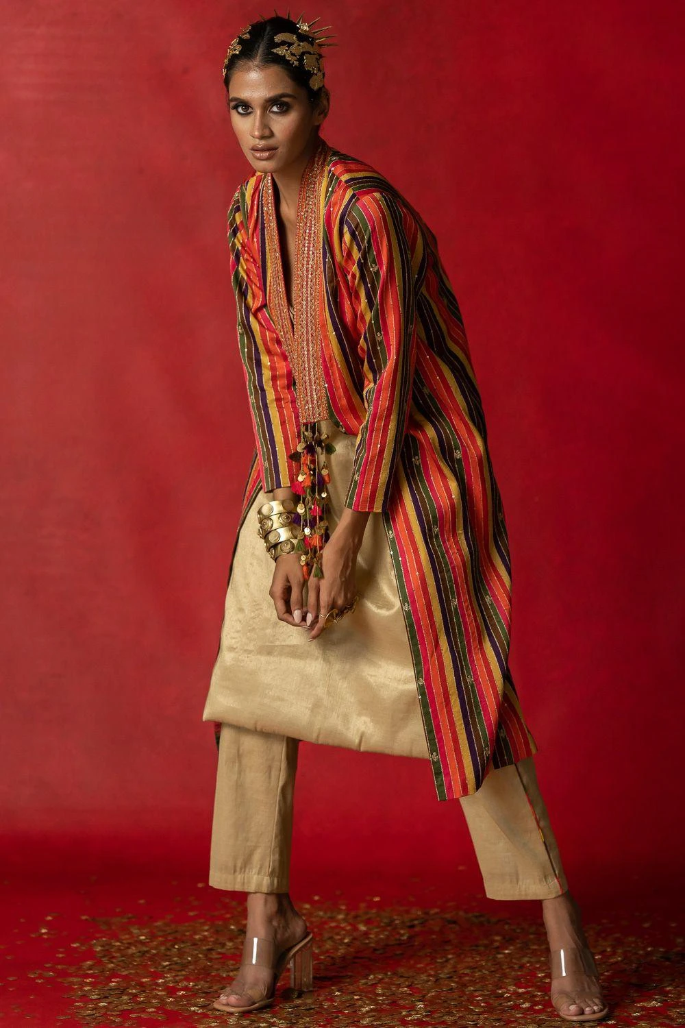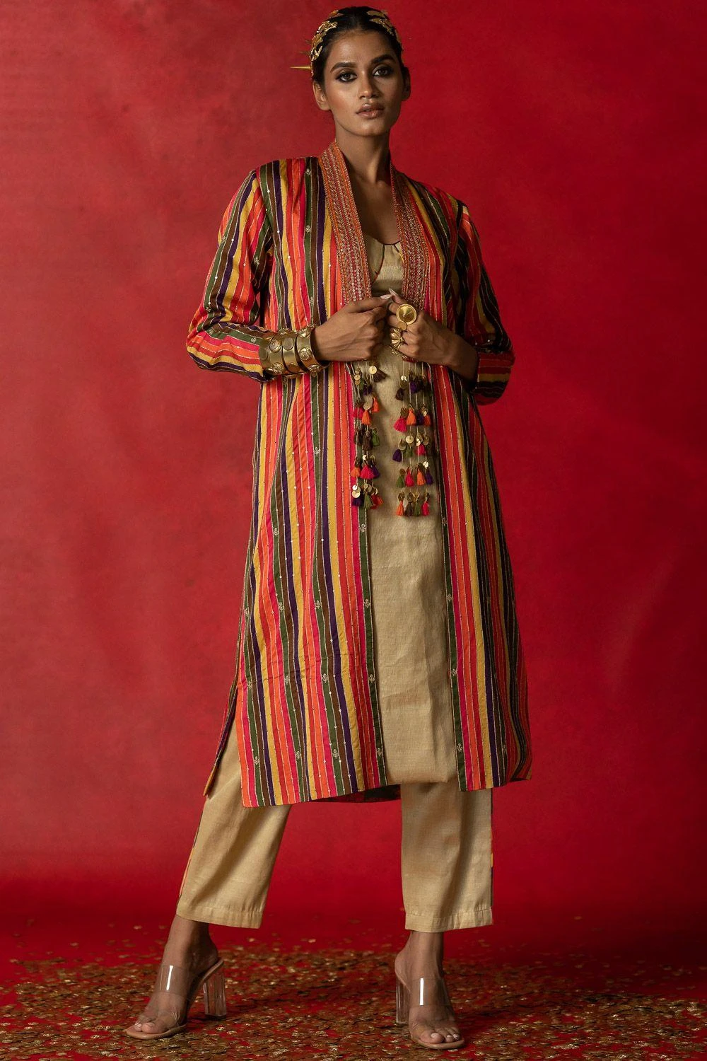 Give your festive closet a vibrant, artisan aesthetic with this kurta set. Crafted in tissue, this set comes with a kurta & straight fit pants. Style this set with the Striped aari embroidered jacket from the collection to complete the look.