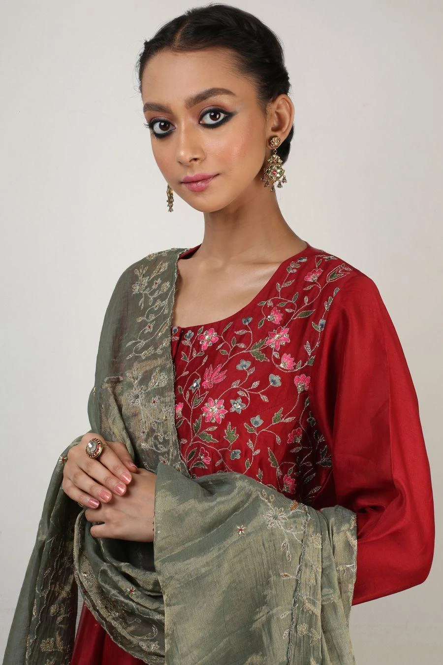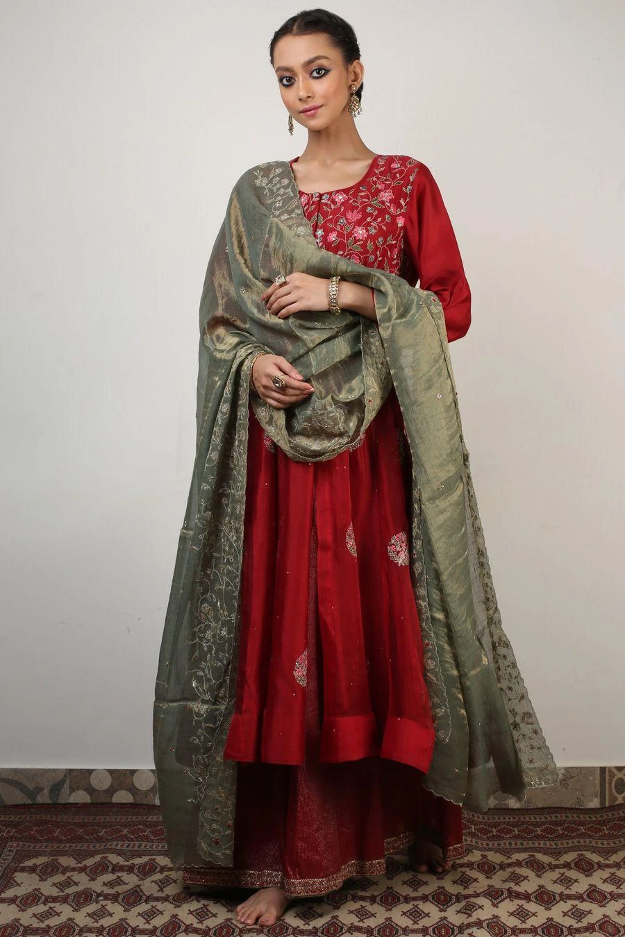 This anarkali set will see you through all kinds of celebrations this festive season. Crafted in aari & zardosi embroidery, this set comes with a red organza & chanderi panelled anarkali paired with a stripe chanderi sharara and a dupatta.