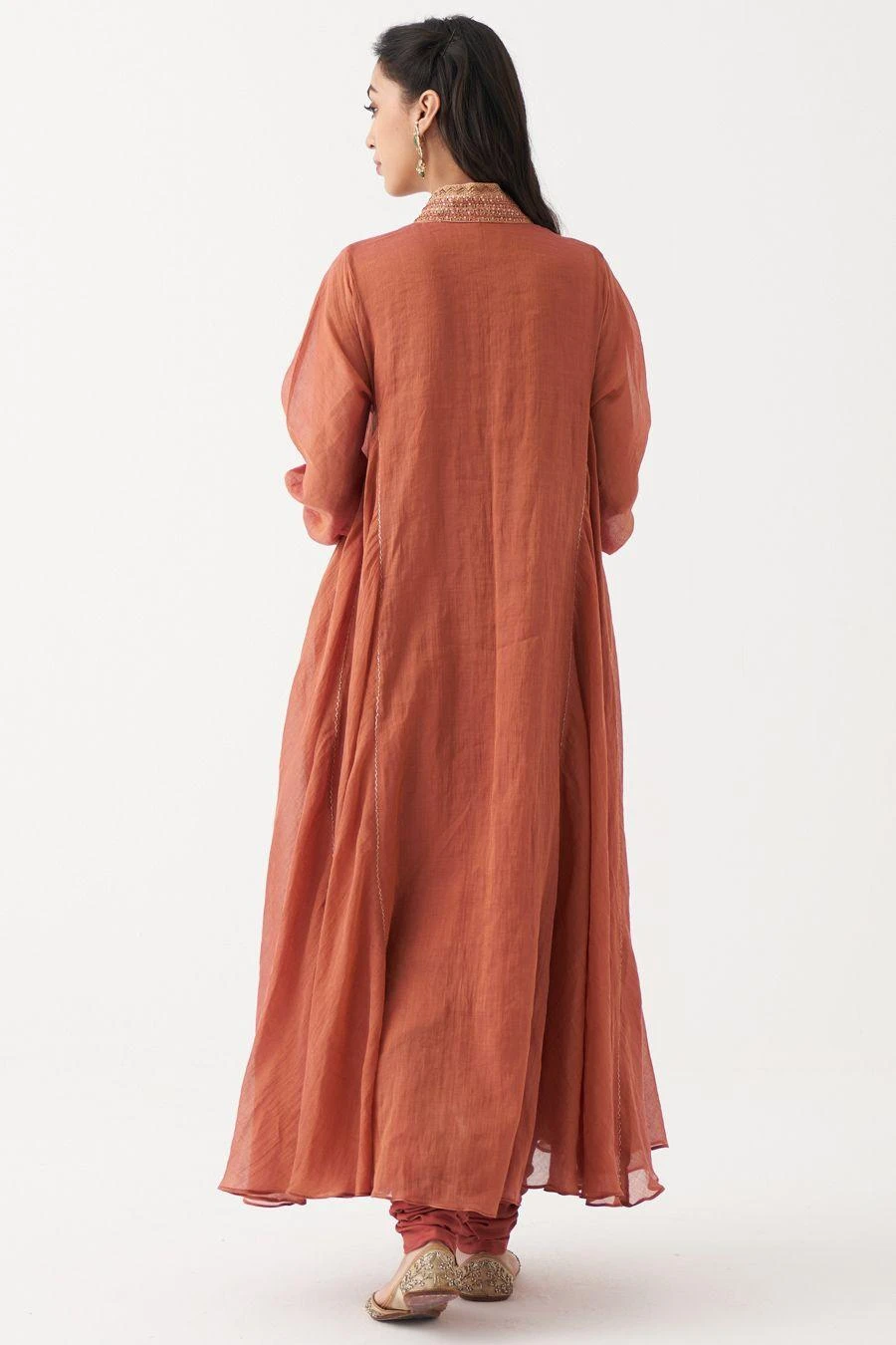 This set will see you through all kinds of celebrations this festive season. Hand crafted with ari and zardozi work, this set comes with an orange handwoven tissue chanderi anarkali paired with a tonal crushed silk dupatta & a cotton silk churidar.
