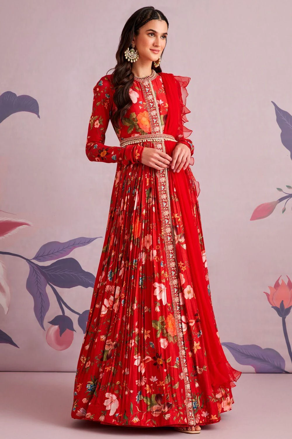 When it comes to festive occasions, you can never go wrong with a classic anarkali. This red floral printed anarkali is highlighted with intricate embroidery on the front placket. It is complemented with a ruffle net dupatta and an embellished belt.