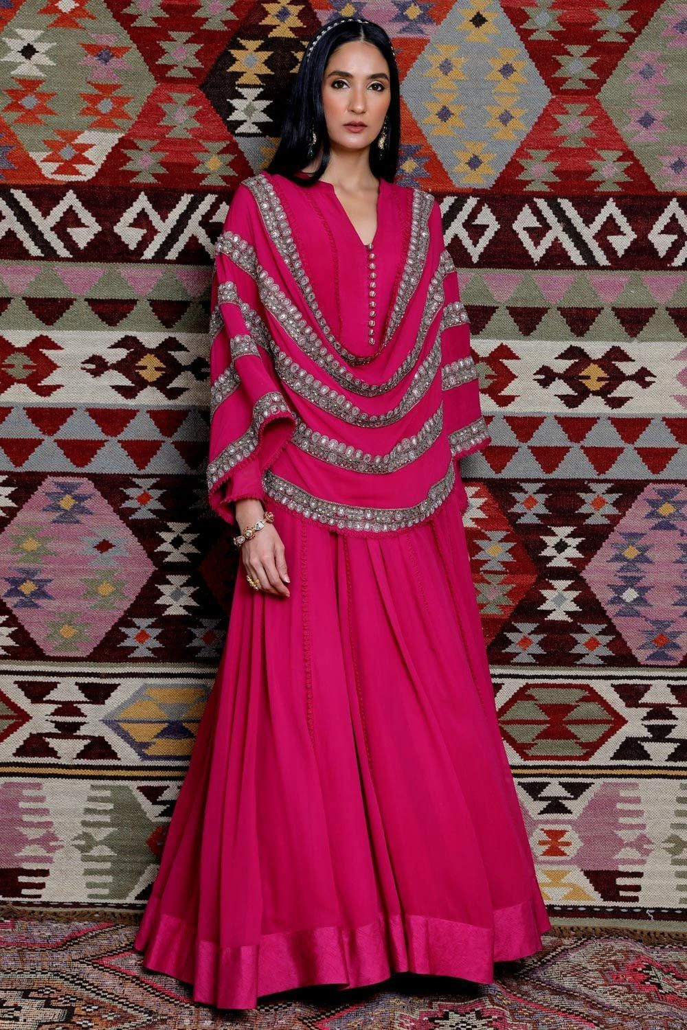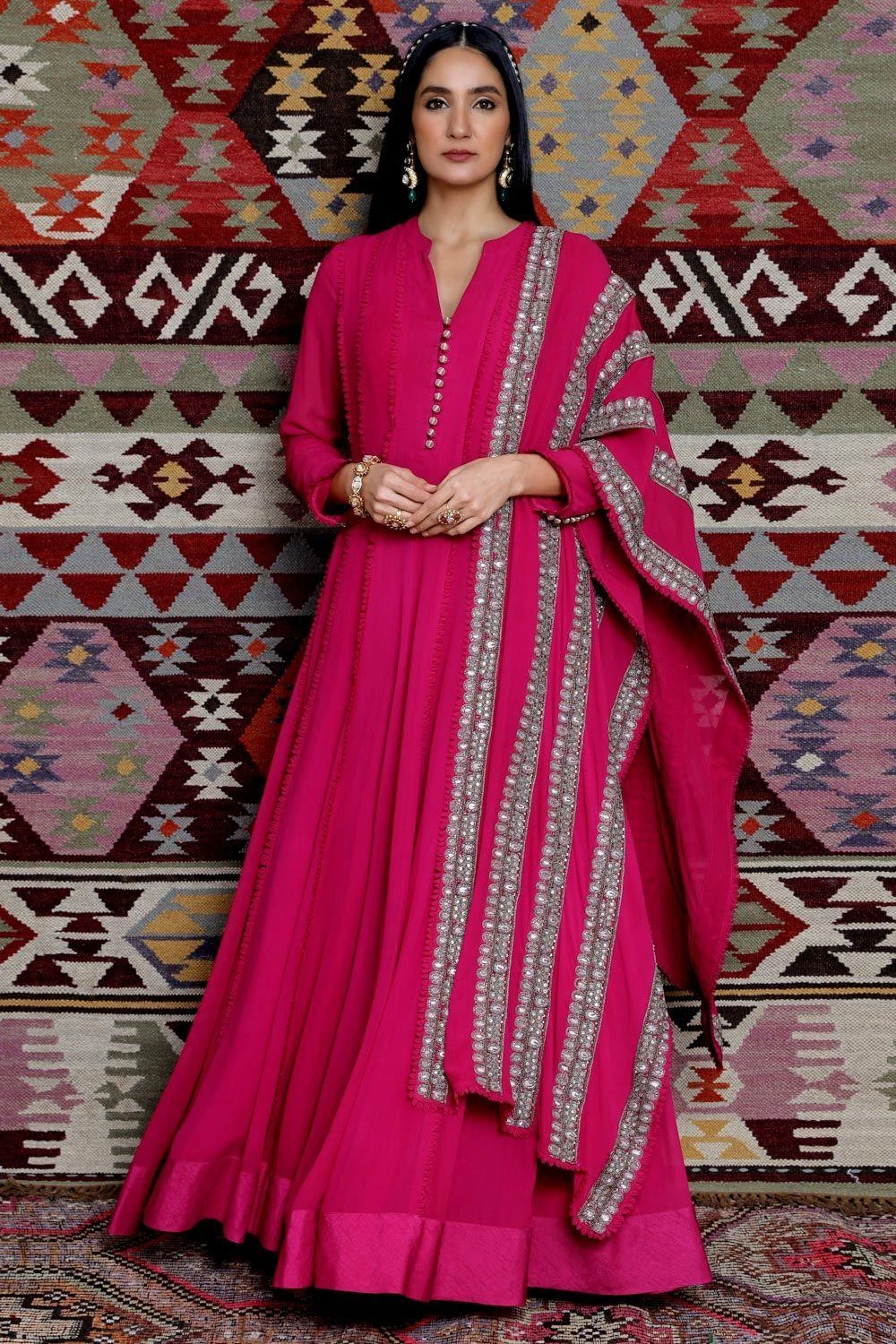 You can never go wrong with a vibrant anarkali at your festive occasions. This fuchsia floor length anarkali in georgette with trim detailing is paired with an embroidered dupatta. You can adorn a pair of chandbalis with this look.