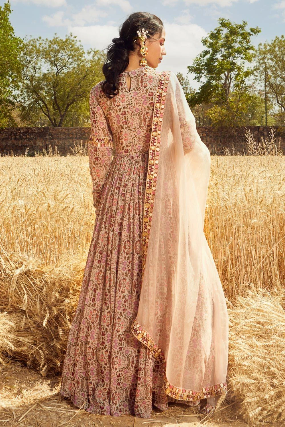 This grey printed angrakha anarkali set is infused with modern & refreshing aesthetics. Cut in georgette, the anarkali is adorned with placement embroidery on the yoke & sleeves. It is paired with a beautiful organza dupatta.