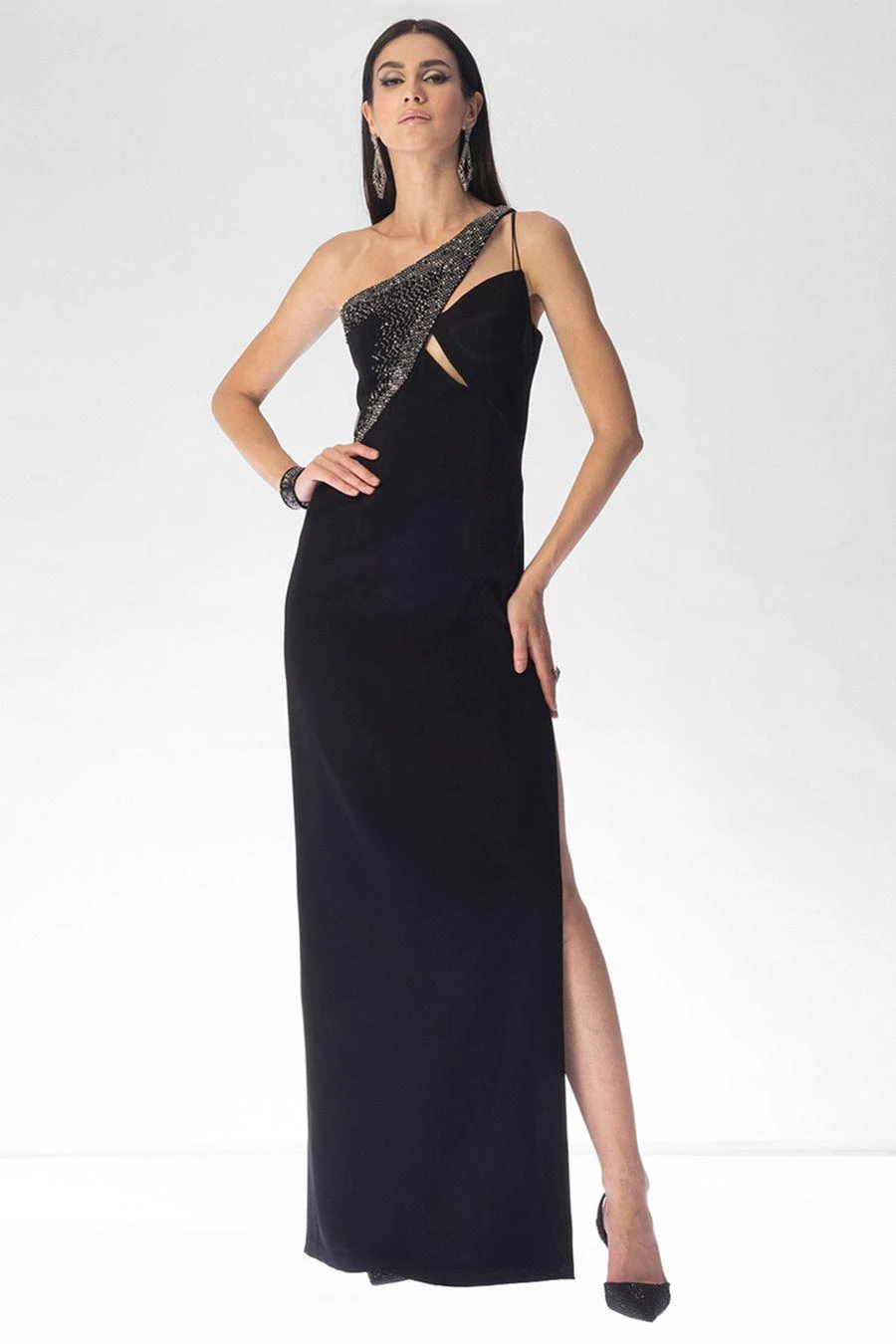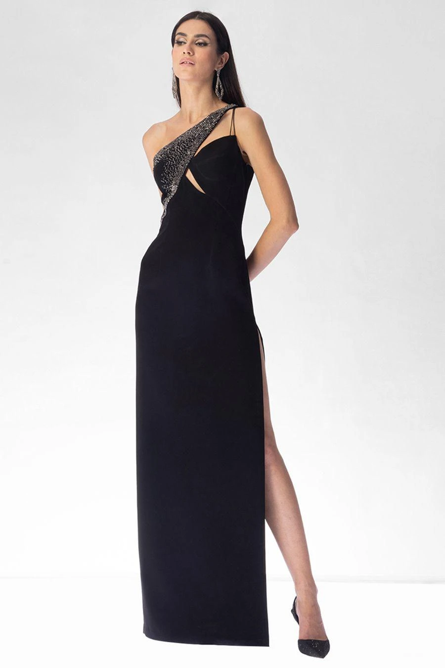 If you’re looking for a head-turning statement-making outfit that isn’t too heavy, this is the dress for you. Crafted in crepe, this handcrafted one shoulder overlapped dress has tonal and metallic embroidery.