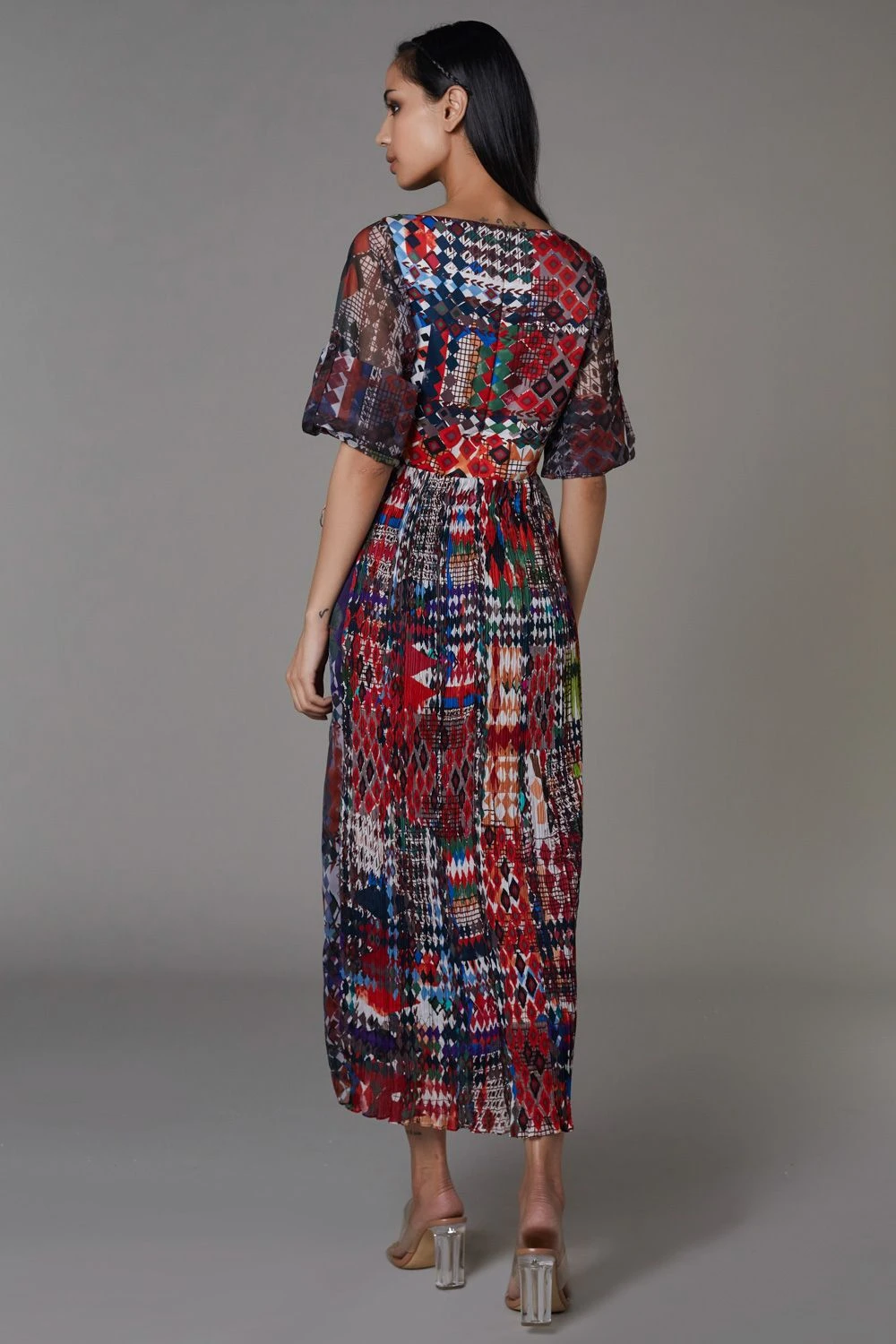 Experience a bohemian euphoria with this masterpiece by the designer duo. It is engineered in micro pleated satin & chiffon with a beautiful sweetheart neckline and features organza sleeves with tie-up details.