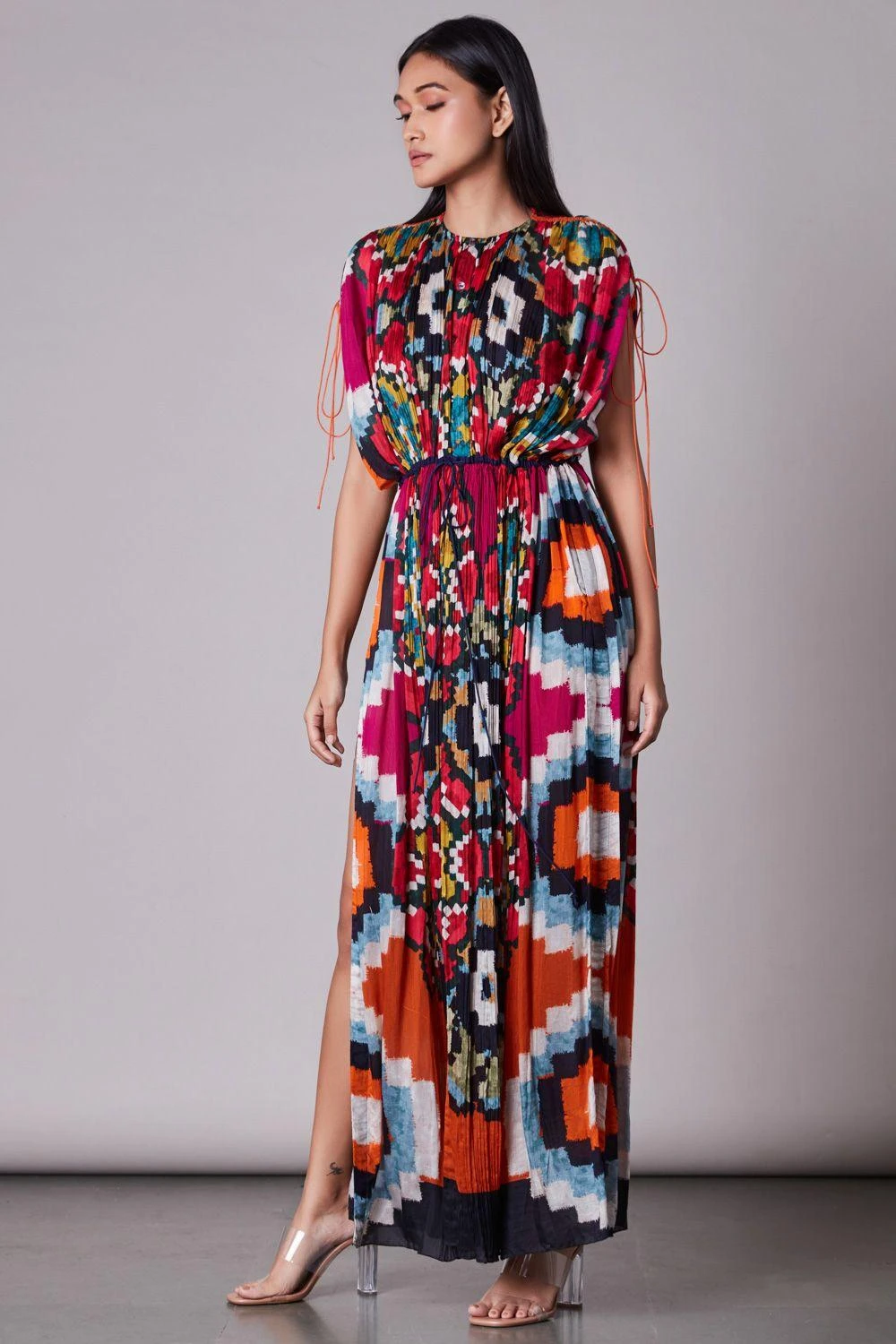 This chic ikat printed kaftan dress is painstakingly created using hand micro pleated techniques. The maxi dress has customisable side slits making it a versatile choice. Style this piece on your next beach vacation or for a dressy sundowner.