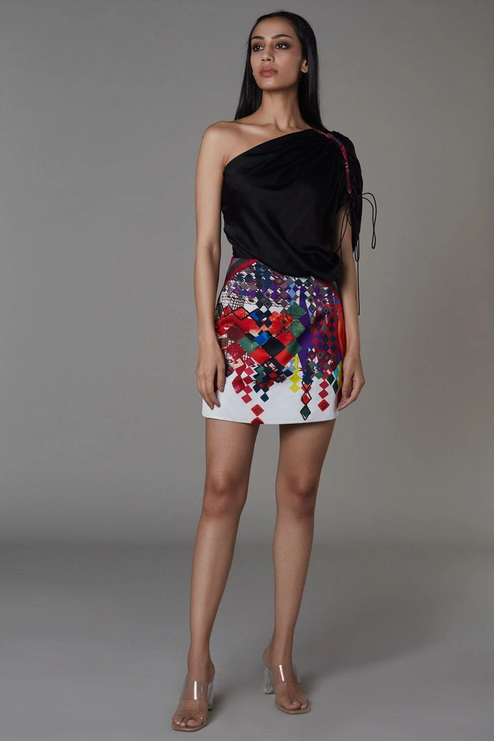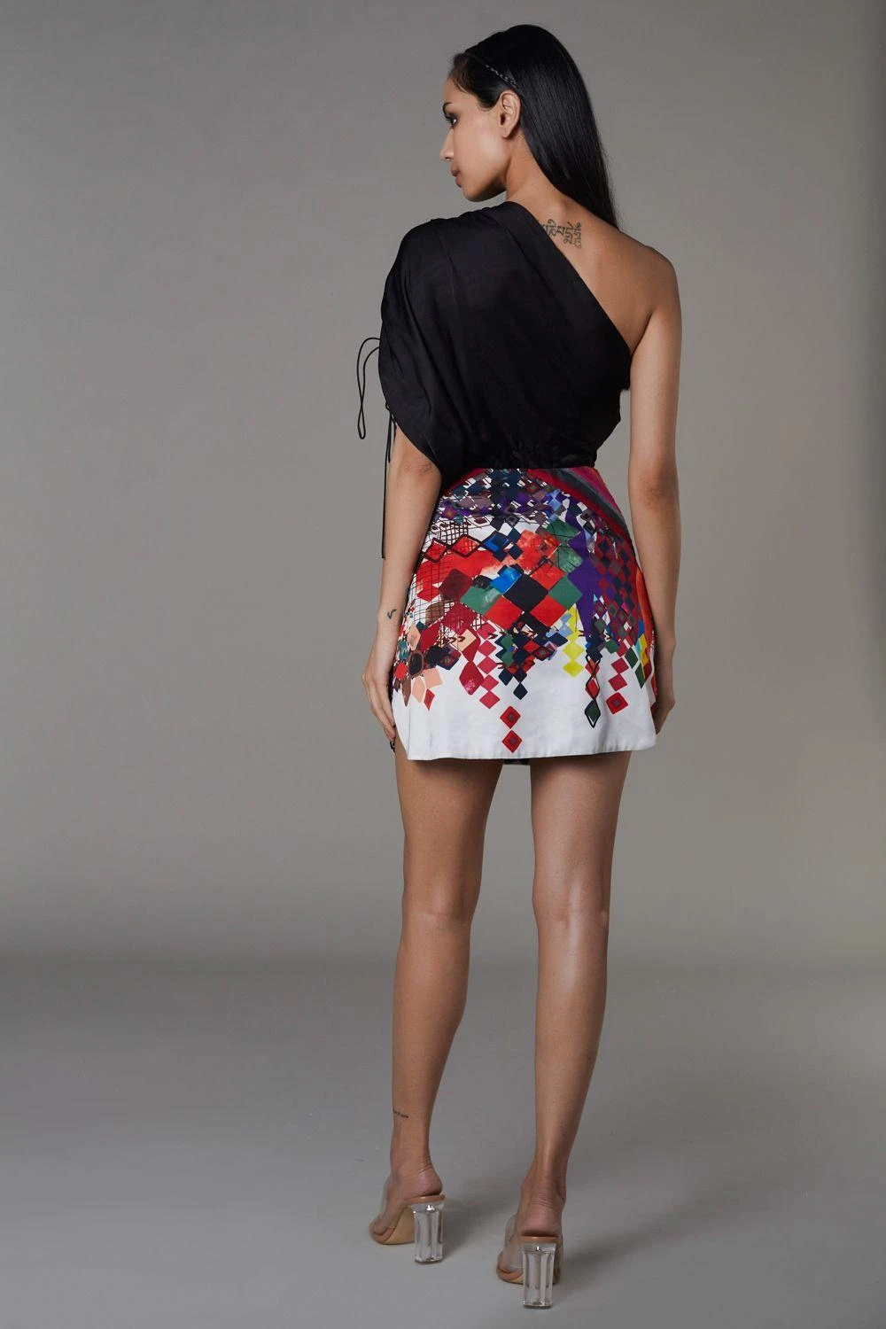 This statement mini dress is cut in a printed & hand micro pleated satin fabric. Style this one of a kind piece with statement earrings & a clutch to complete the look.