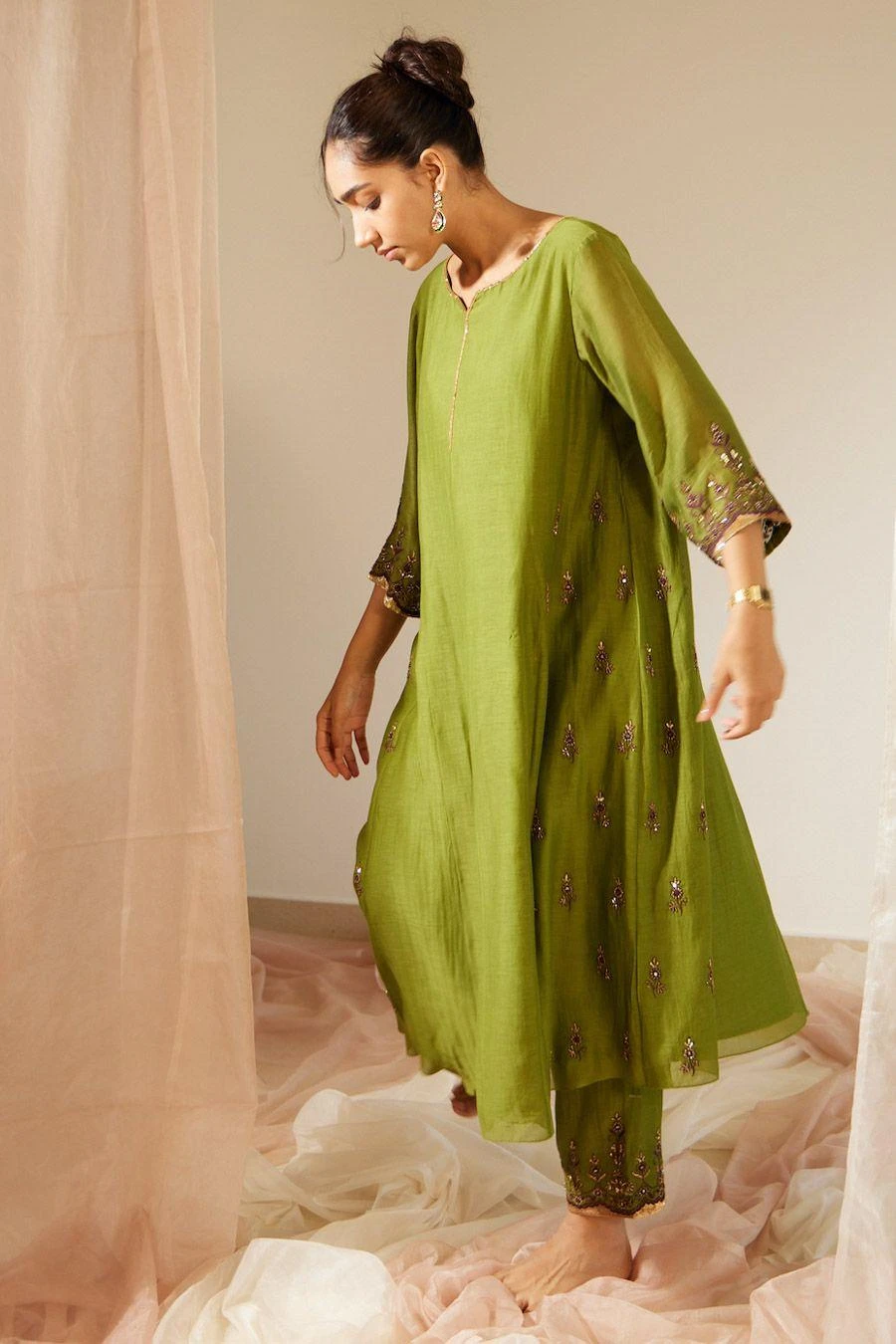 Immerse yourself in the enchantment of this kurta set. Radiating elegance & grace, this meticulously crafted ensemble captures the essence of timeless beauty. With its captivating hue & design, it is a celebration of refined style & sophistication.