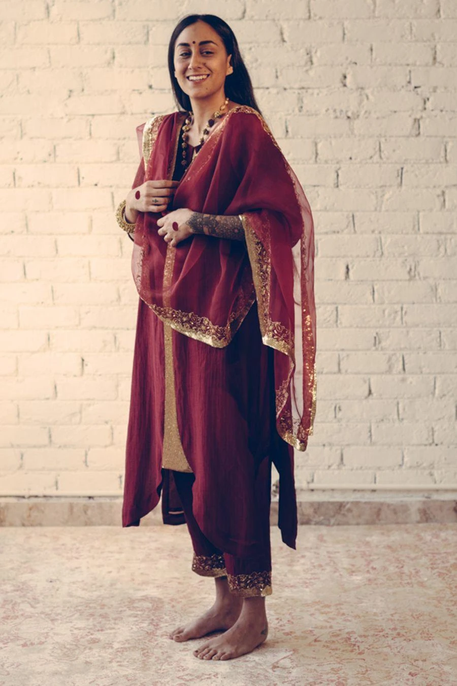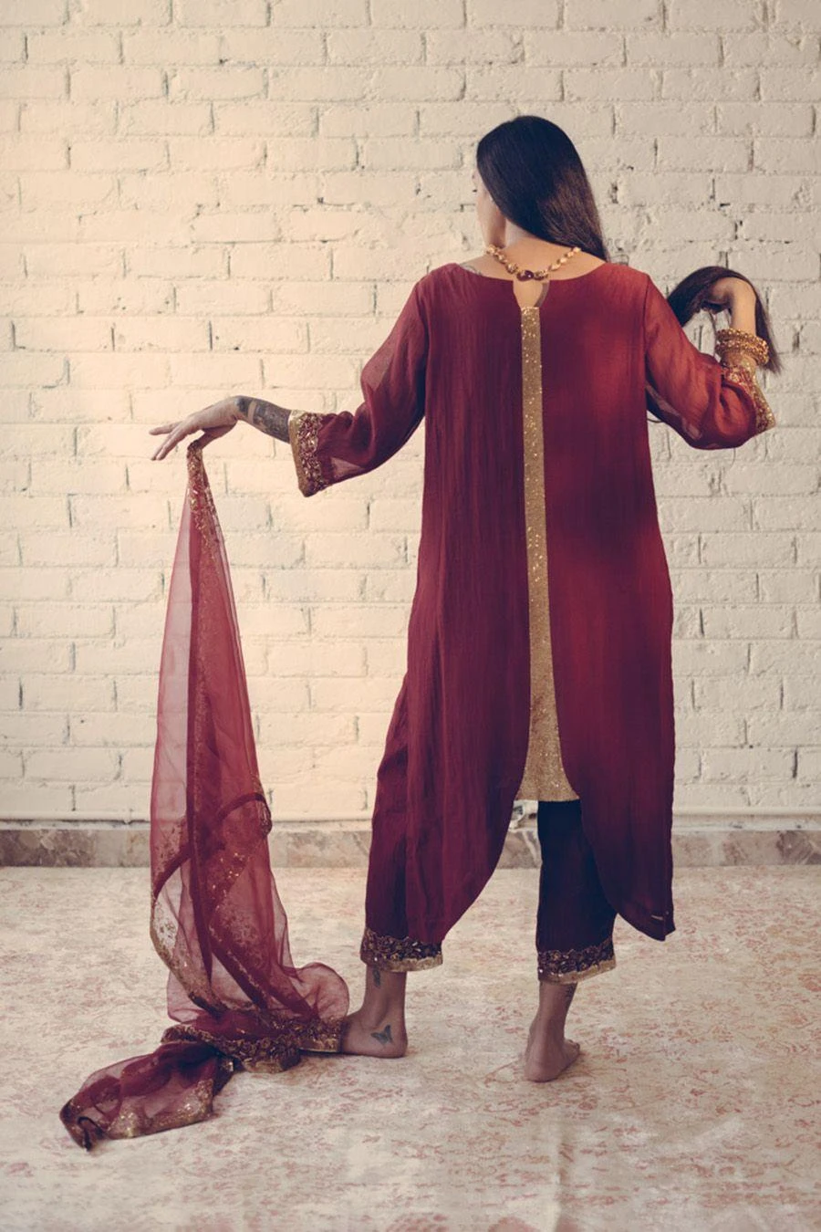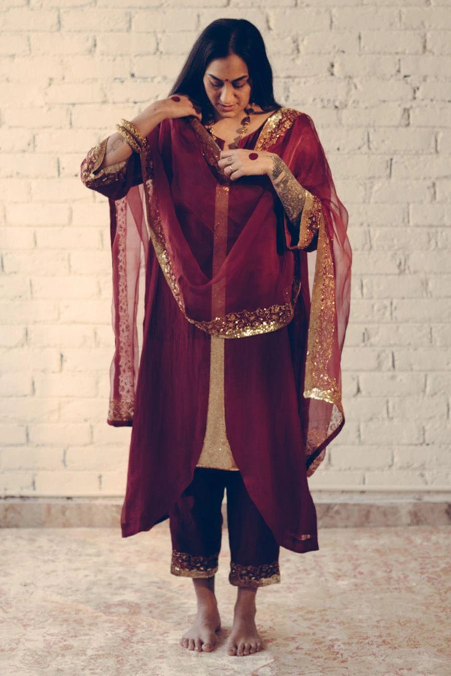 This understated kurta set is a must have for your closet this festive season. Crafted in chanderi silk, this set features a hand embroidered kurta & matching pants. Pair it with the Maroon Nizam stole from the collection to complete the set.