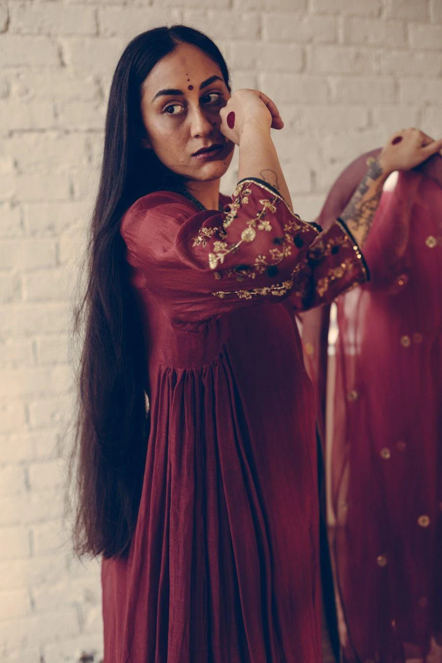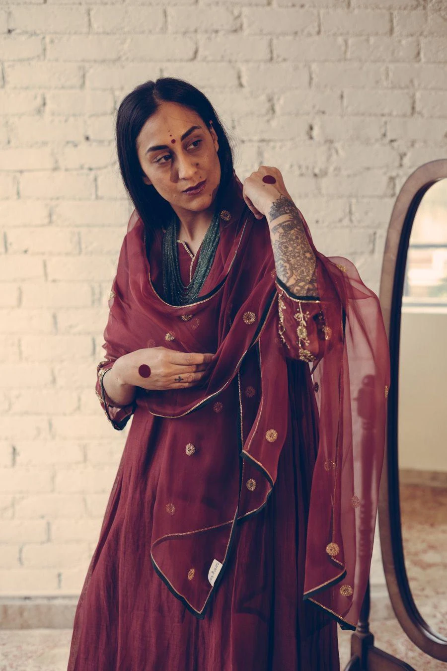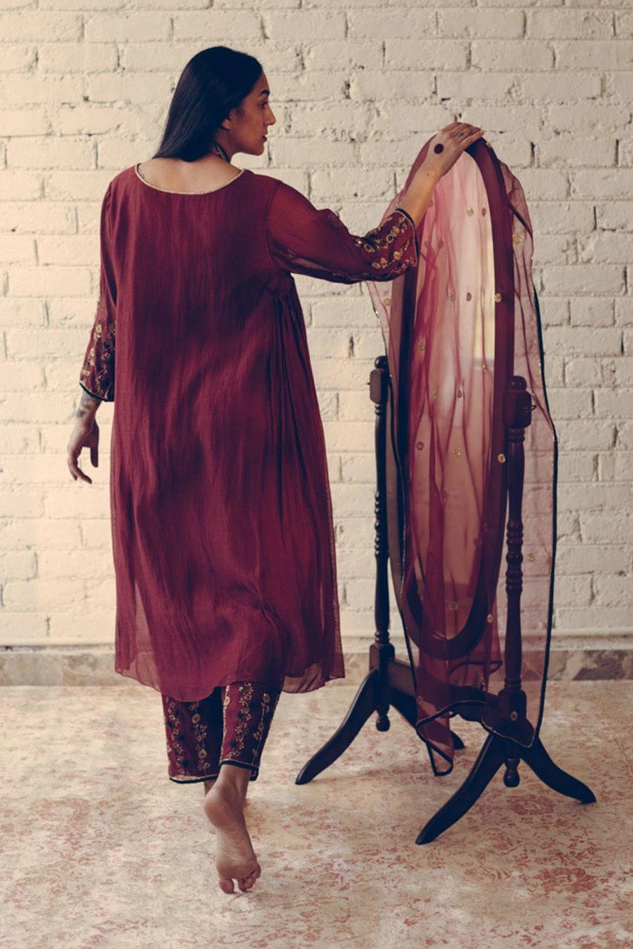 Take your layering game a notch higher with this maroon stole. Crafted in organza silk, this dupatta features hand embroidered details. Layer it over the Maroon Ranjeet kurta set from the collection to complete the set.
