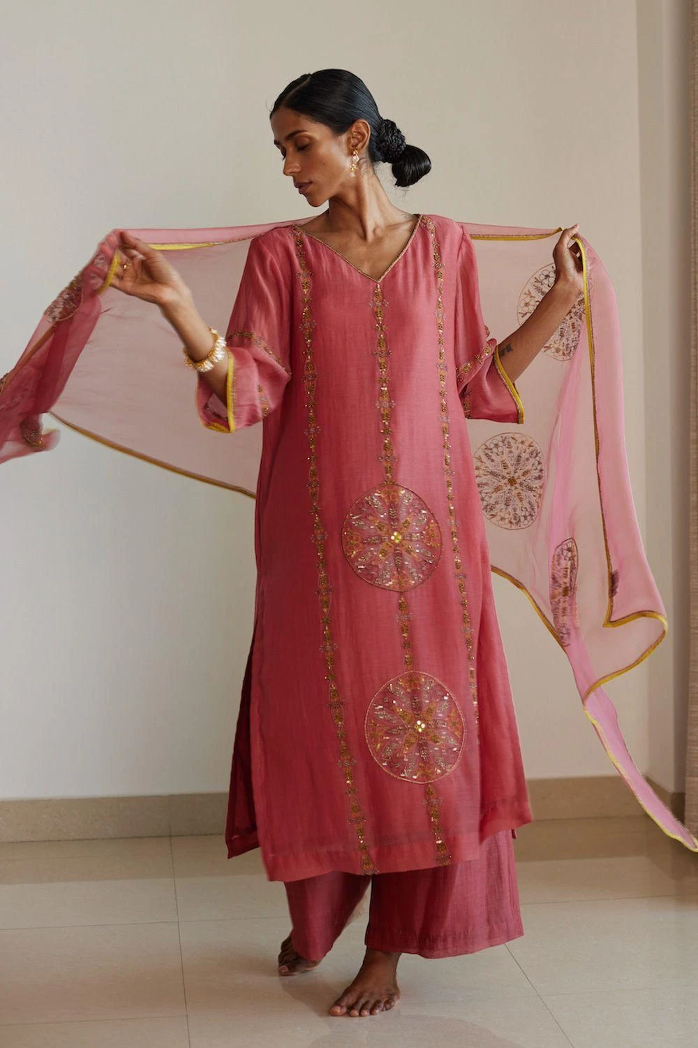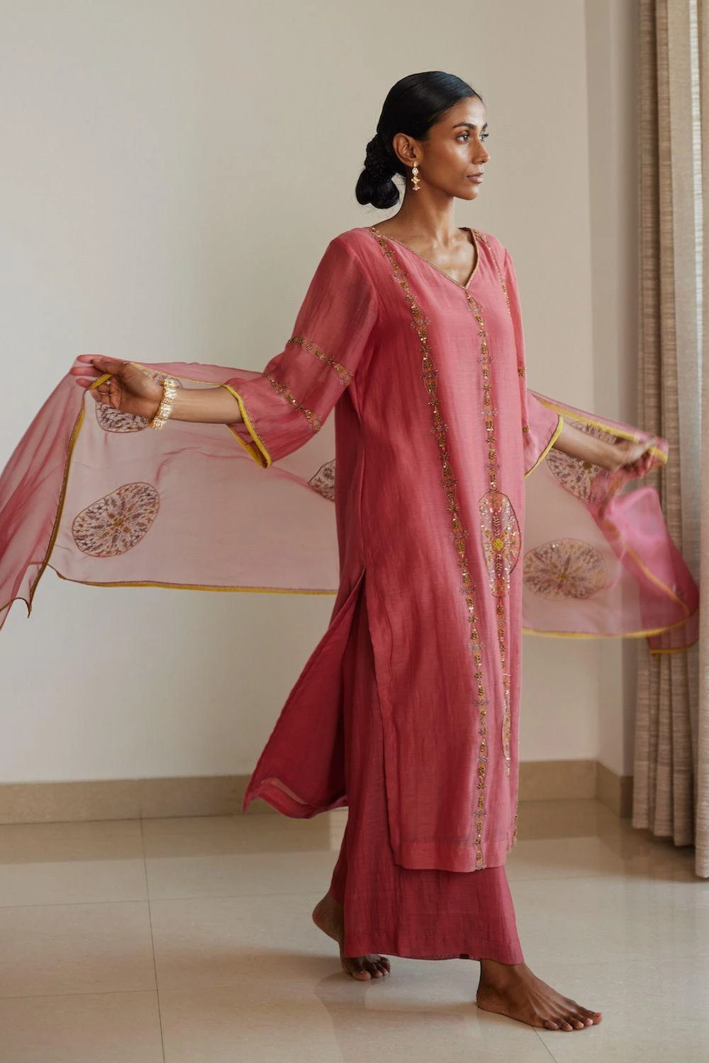 Wrap yourself in the exquisite elegance of this Pink Uday Stole, a versatile accessory that effortlessly elevates your style. Layer it over the Pink Uday Kurta Set from the collection to complete the set.
