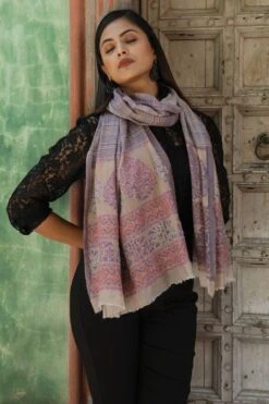 Dusala India White Cashmere Fine Wool Floral Aari Work Stole