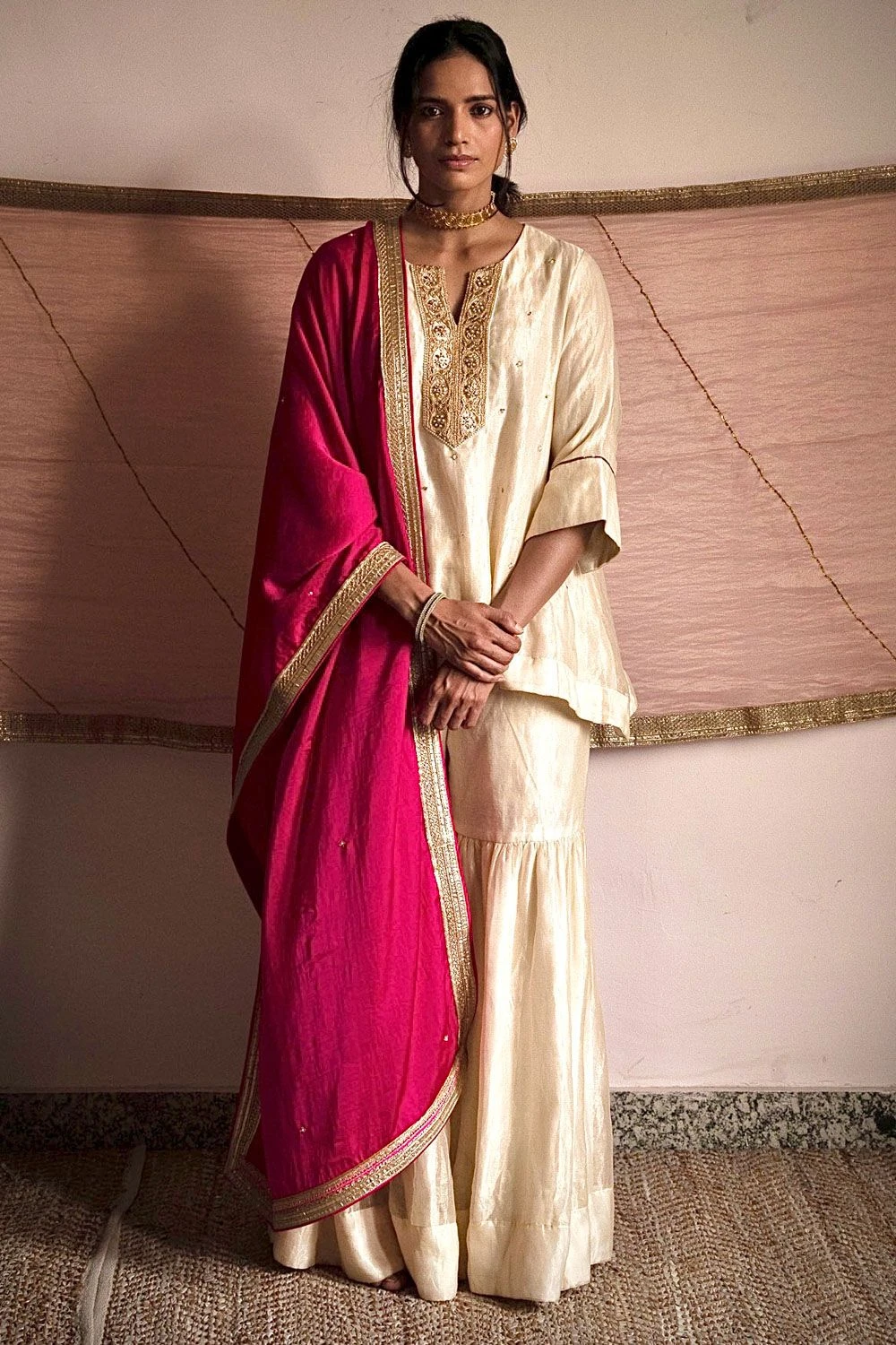 Take your layering game a notch higher with this dupatta. Crafted in silk satin, this hand done gota features gota embroidery with lace trims. Layer it over a hand embellished gharara set from the collection to complete the set.