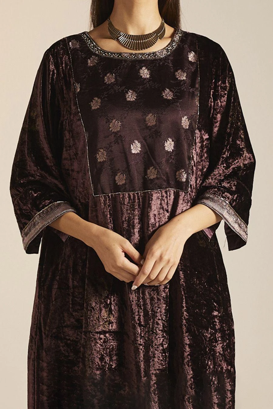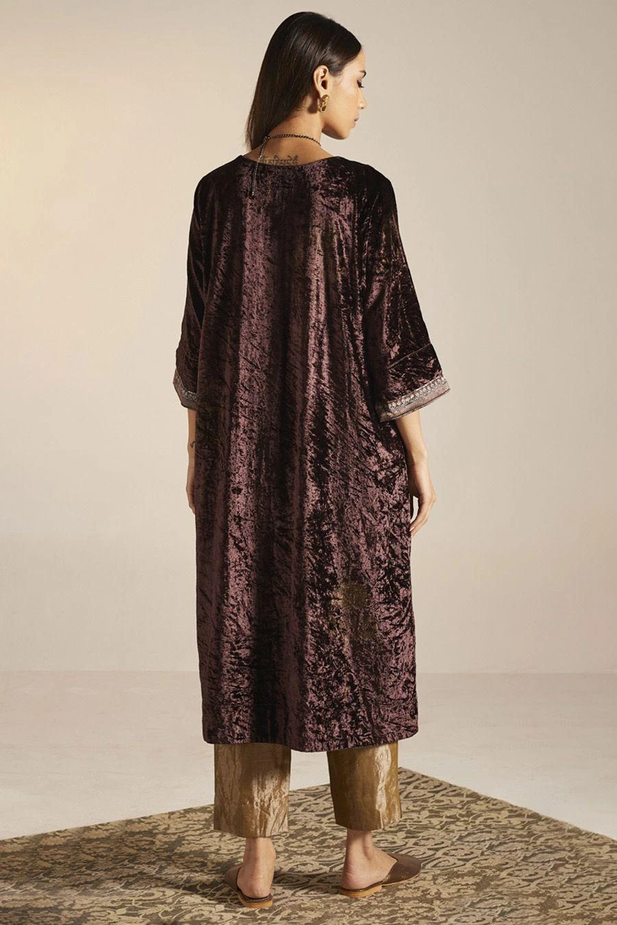 The perfect amalgamation of style and comfort, this kurta set falls in the realm of luxe minimalism. Crafted in silk velvet, this exquisite handblock printed kurta is paired with straight pants. Add a pair of statement earrings to complete the look.