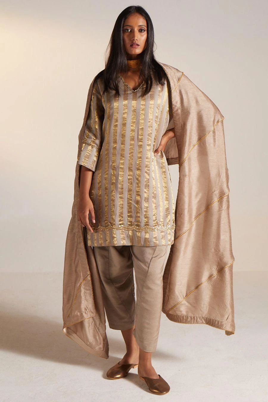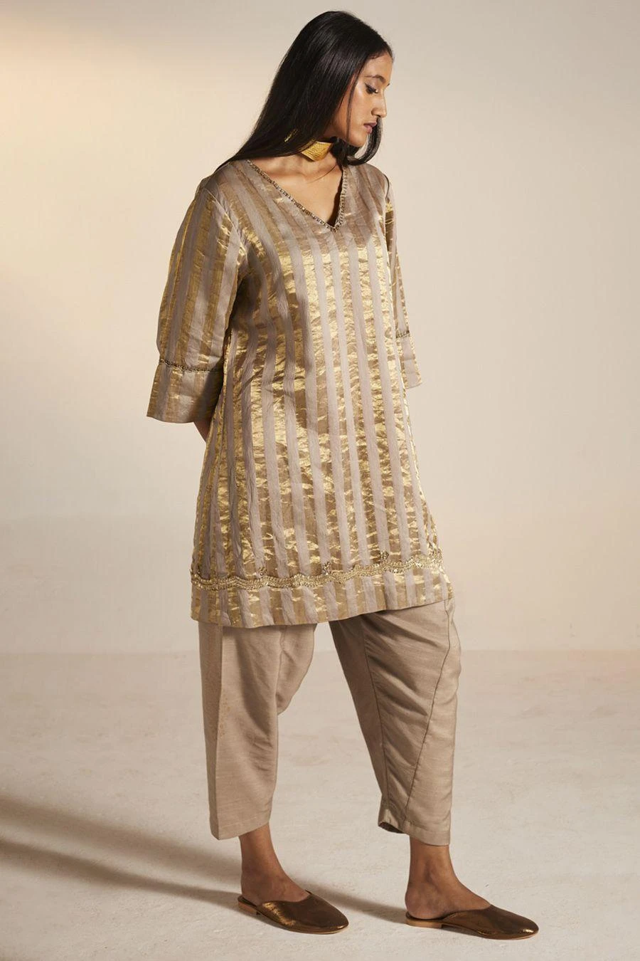 The perfect amalgamation of style and comfort, this kurta set falls in the realm of luxe minimalism. Crafted in handloom tissue, this exquisite kurta is paired with cotton silk pants. Add a pair of statement earrings to complete the look.