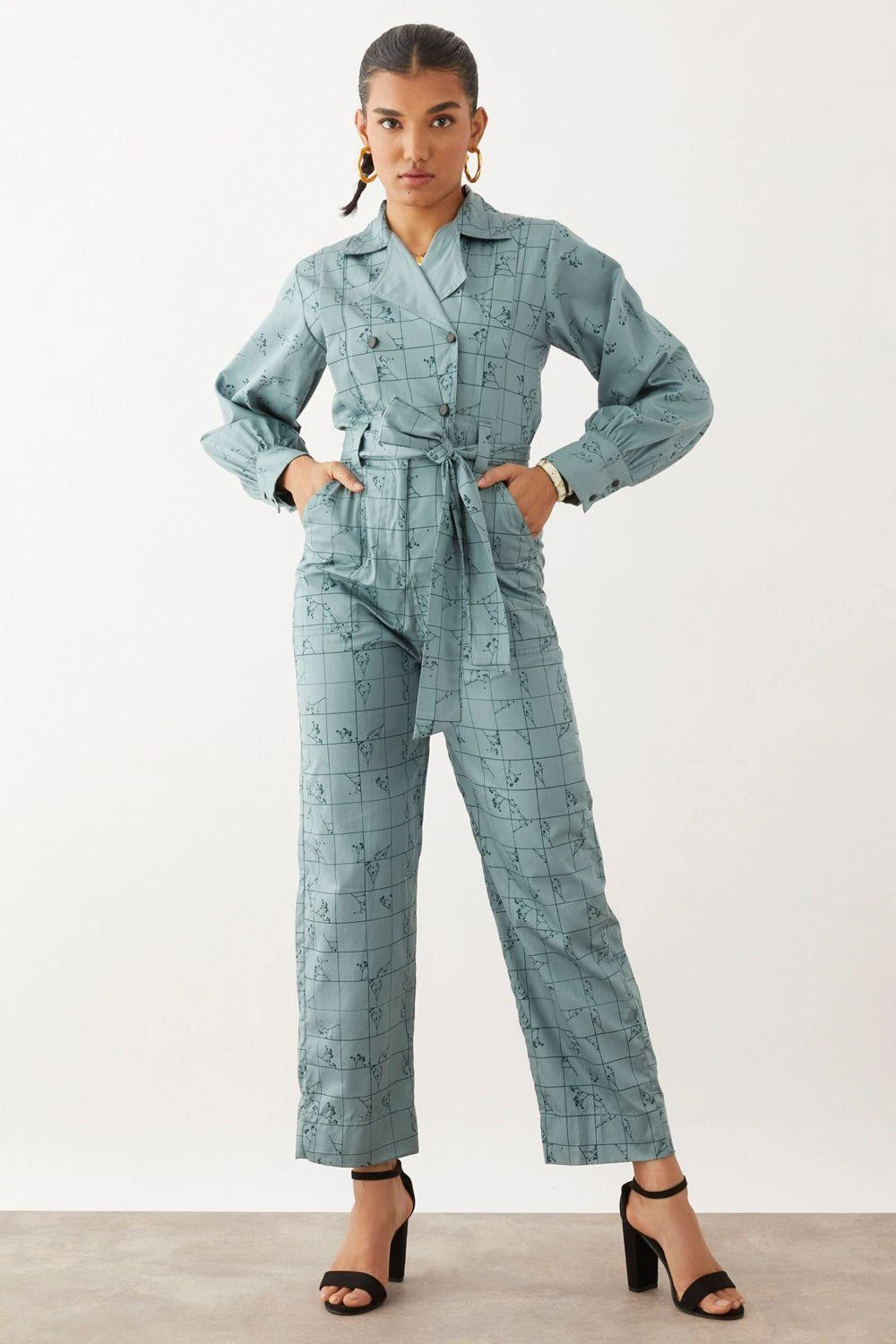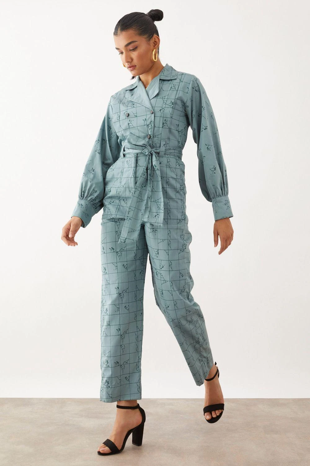 Elevate your style with this abstract Print Jumpsuit. Angular pleats and a unique double-button placket with a waist tie create a modern and chic silhouette, making a bold statement.