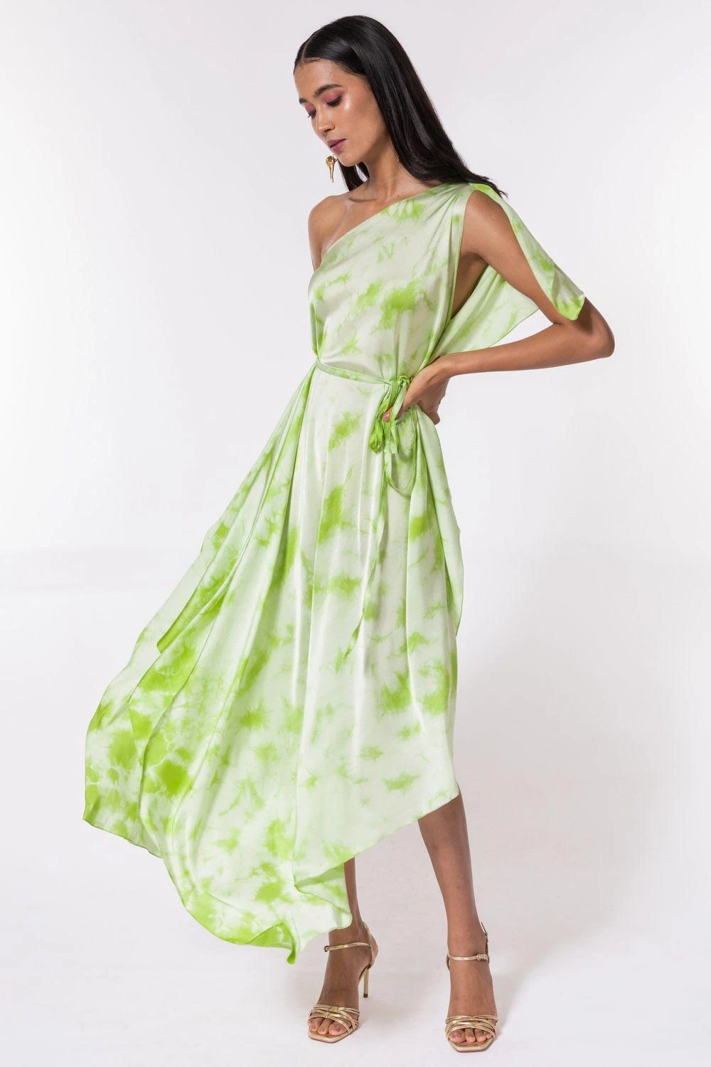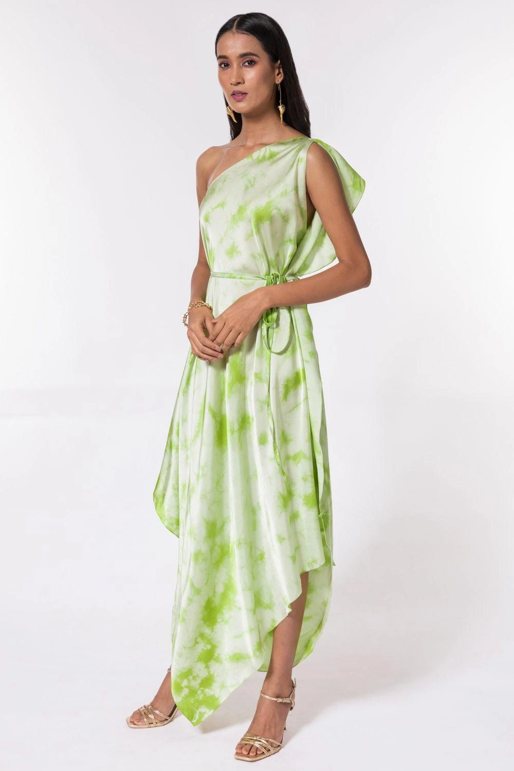 Make the most of summers in this easy-breezy one shoulder dress in silk satin. It is enhanced with fold-dye technique and comes along with a matching belt to adjust the waist. Style it with a pair of drop earrings & heels.