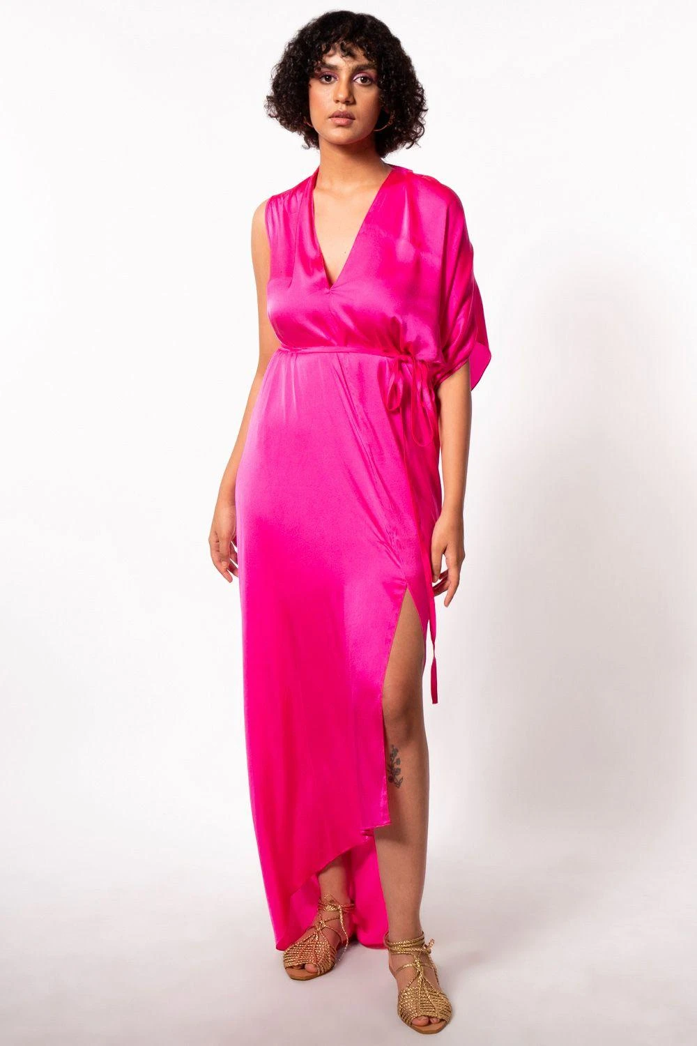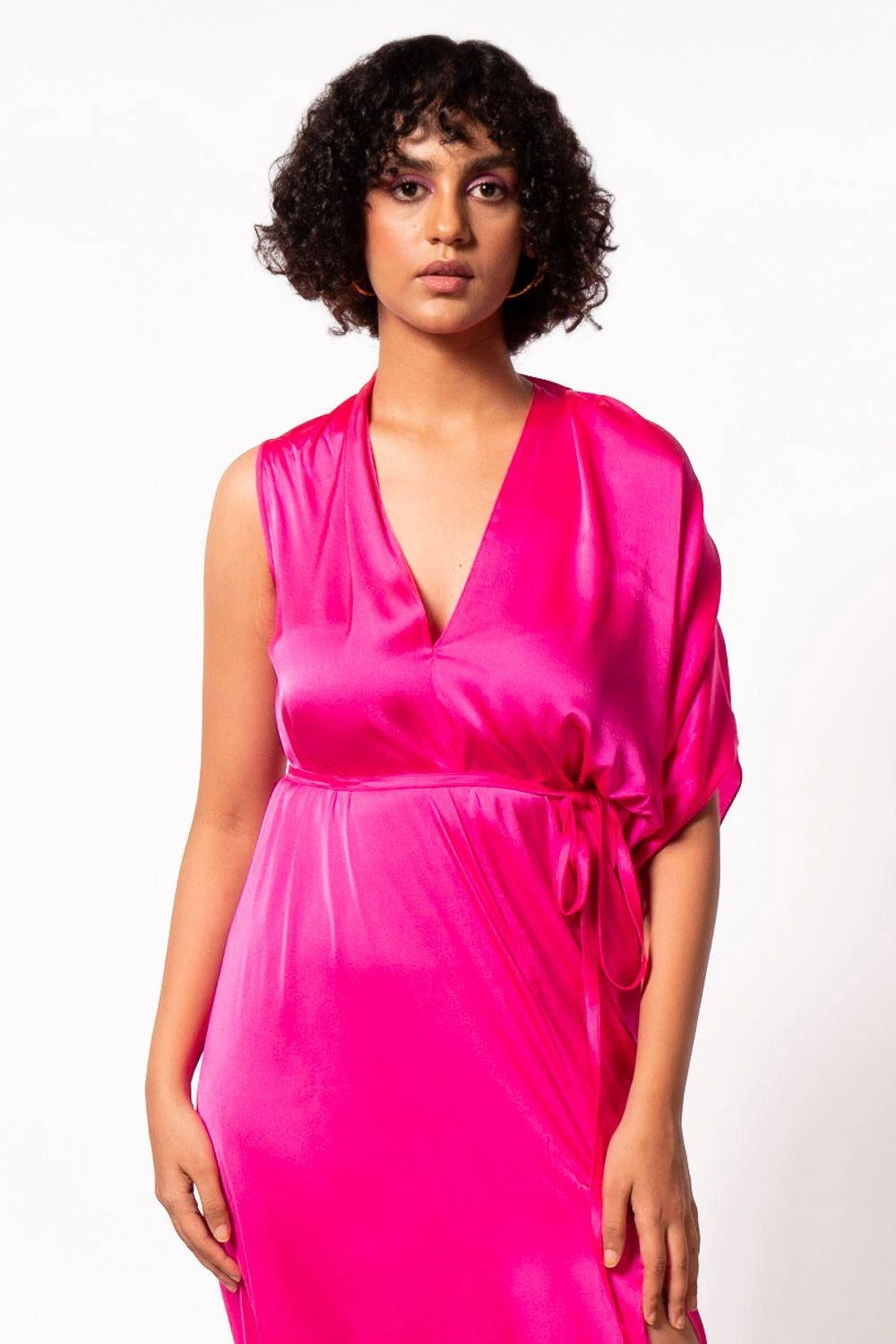 Fun & flirty, this pink dress is the perfect holiday pick. It is cut in stretch satin fabric with a drawstring detail and a V-neck. You can style this piece with a pair of oversized hoops for an elevated look.