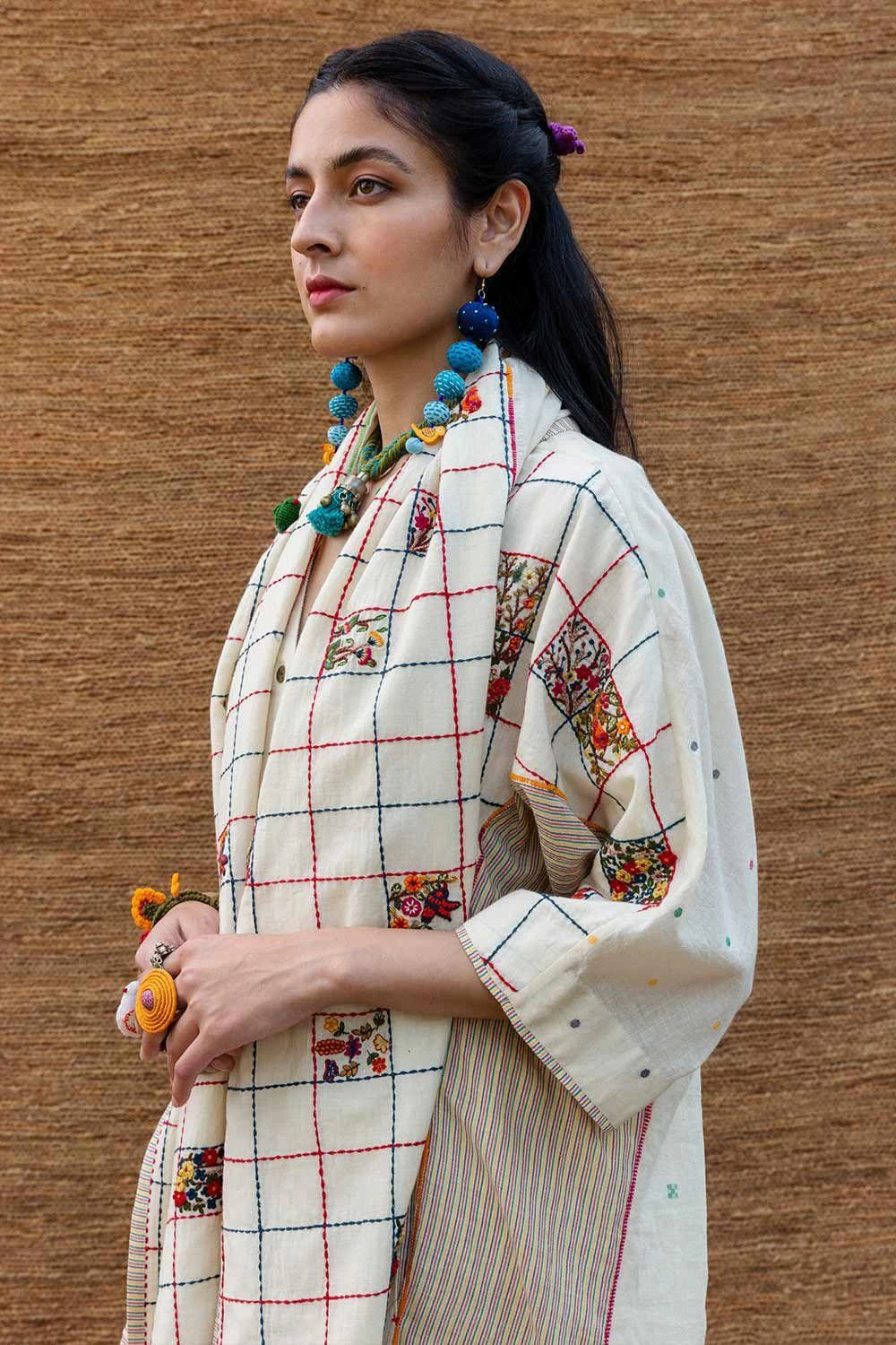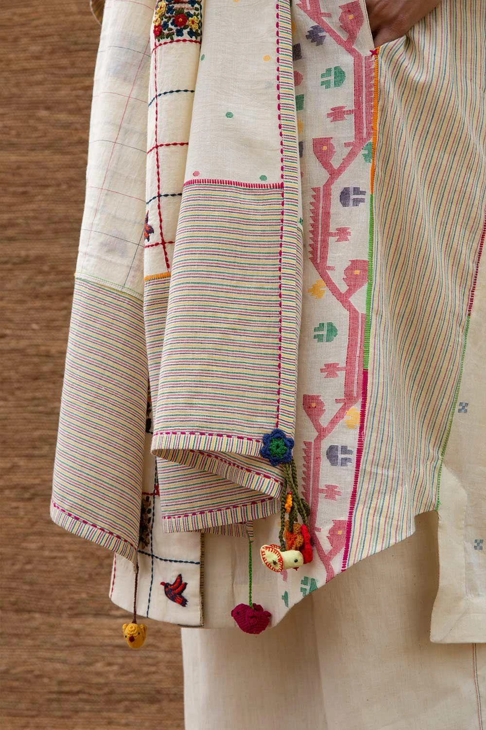 This kora patchwork stole is crafted in jamdani muslin with intricate embroidery inspired by spring flowers & birds. You can wrap it around your neck with a coordinating kurta set for a dressed up look.