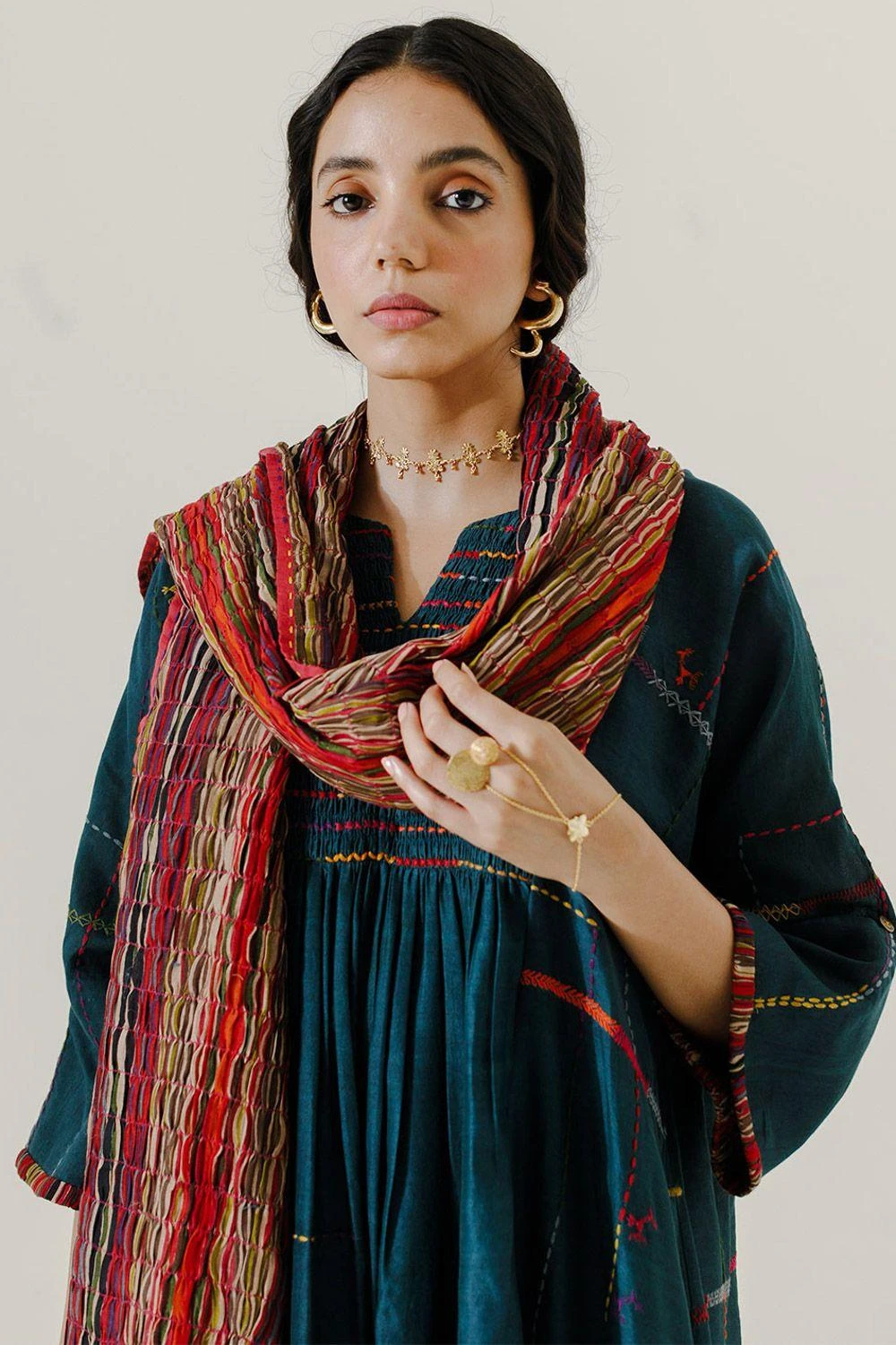 Take your layering game a notch higher with this multicoloured stole. Crafted in handwoven chanderi, this stole features stitch details and crafted tassels. Layer this stole with a kurta set or a dress to complete the look.