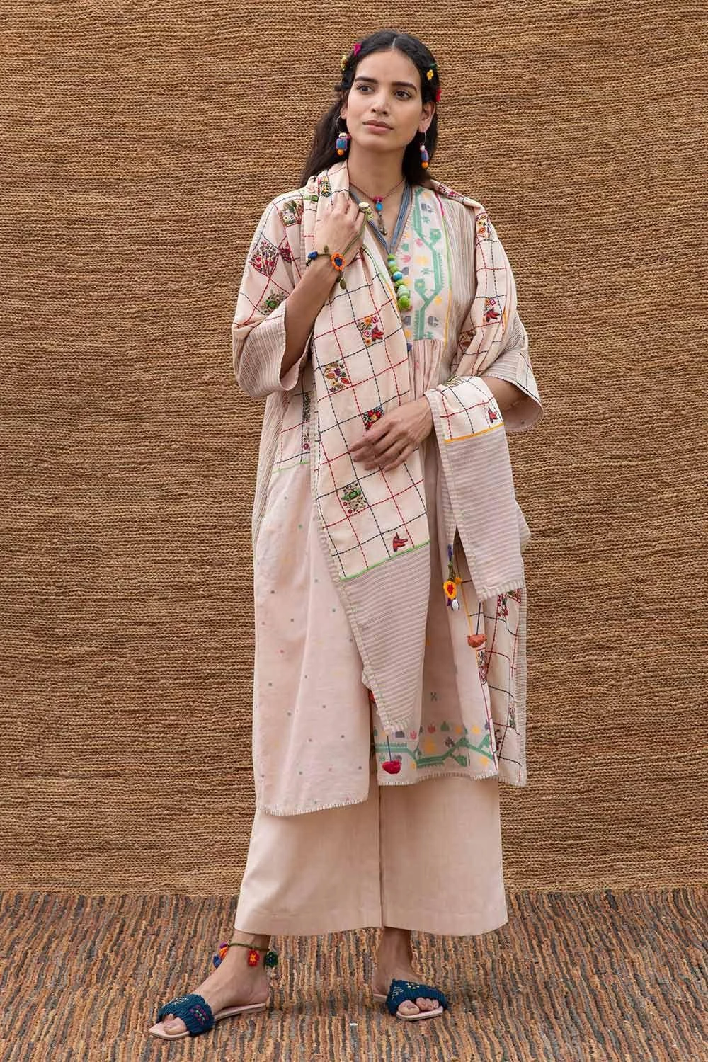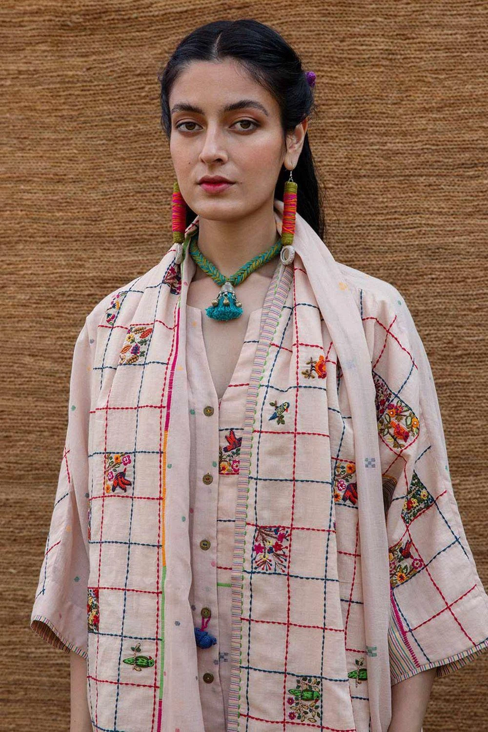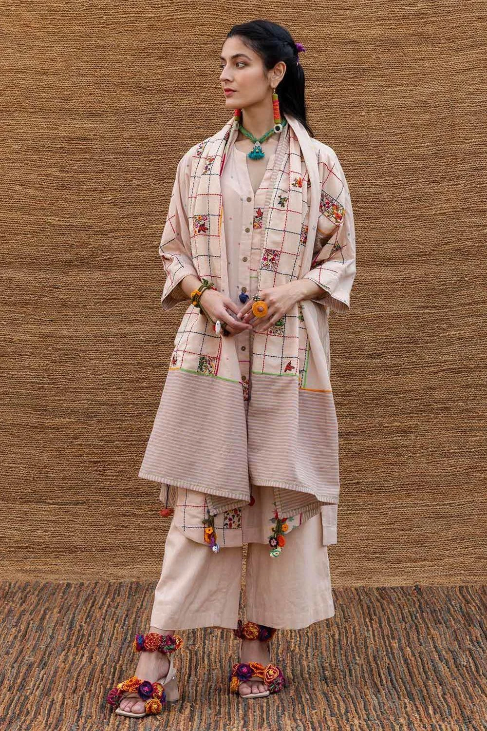 This pink patchwork stole is crafted in jamdani muslin with intricate embroidery inspired by spring flowers & birds. You can wrap it around your neck with a coordinating kurta set for a dressed up look.