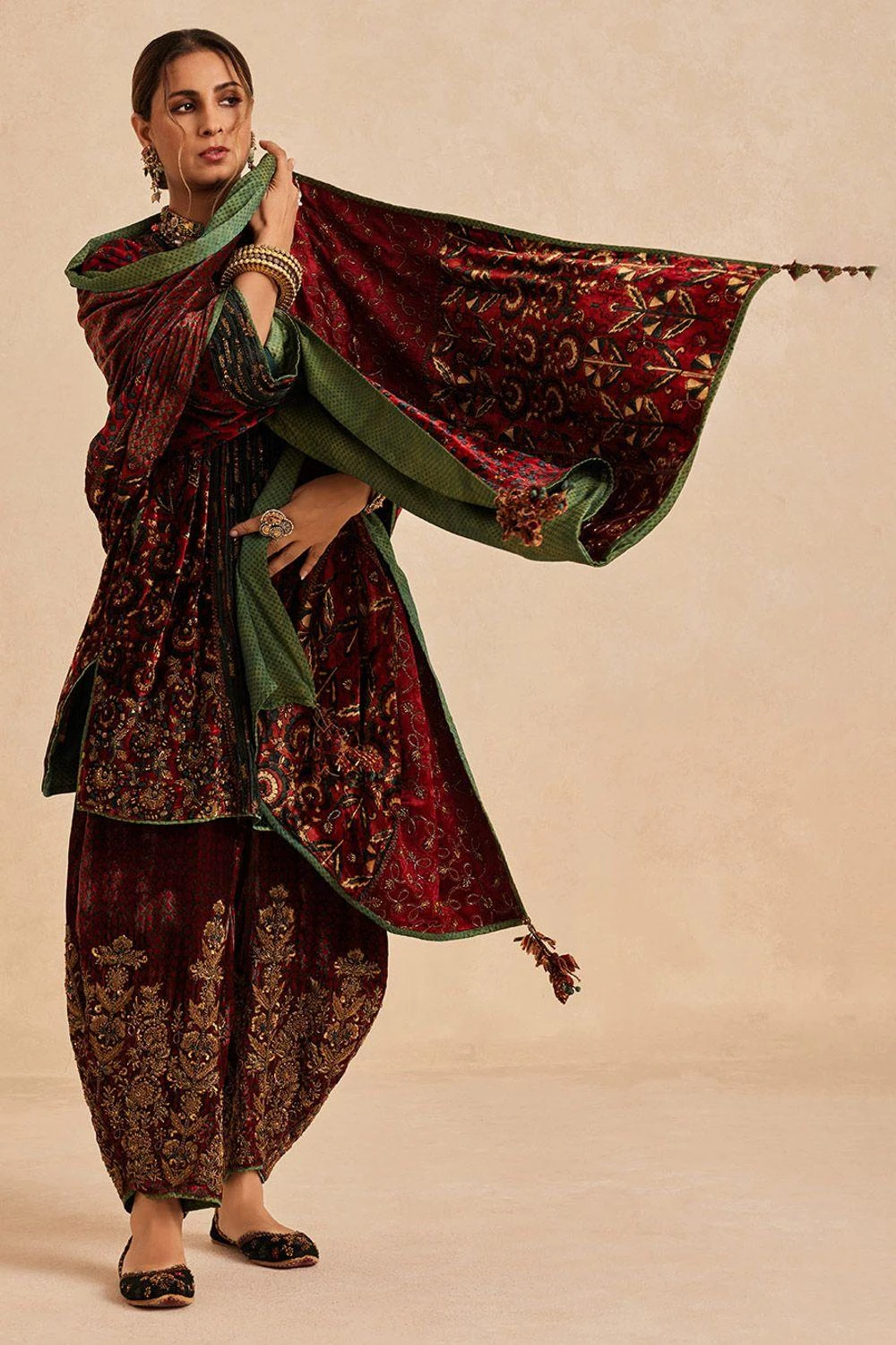 Indulge in luxury with this statement Doshala. Crafted from Ajrakh hand-block printed velvet, each patch is a canvas of intricate zardozi workùDabka, Tilla, Metal Sequins, and Kasab Doriùa harmonious symphony of craftsmanship.
