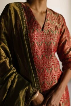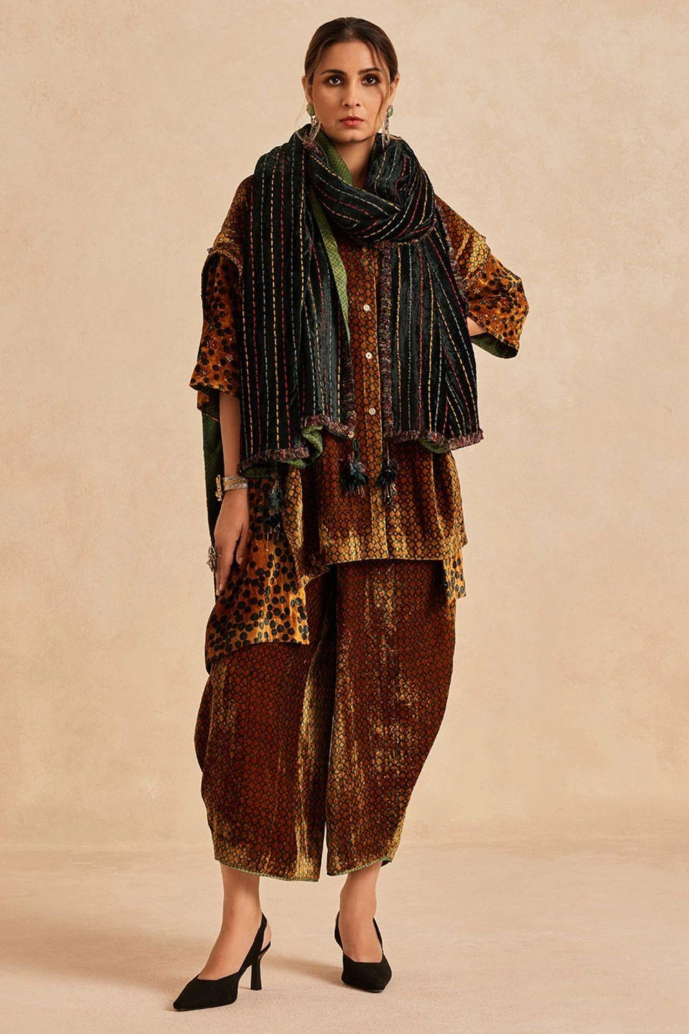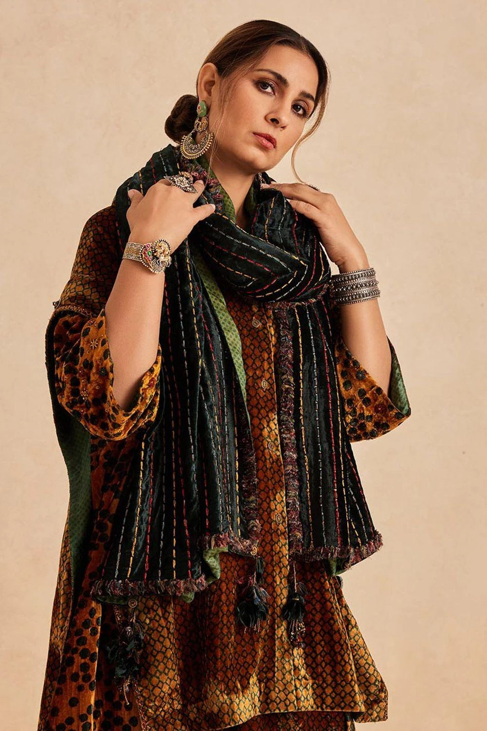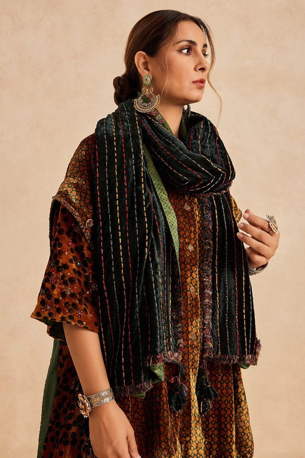 Adorned with multi-coloured stitch lines and upcycled hangings, this velvet stole exudes sophistication. Signature silk Bagru print on the edges adds a distinctive touch to this luxurious accessory.