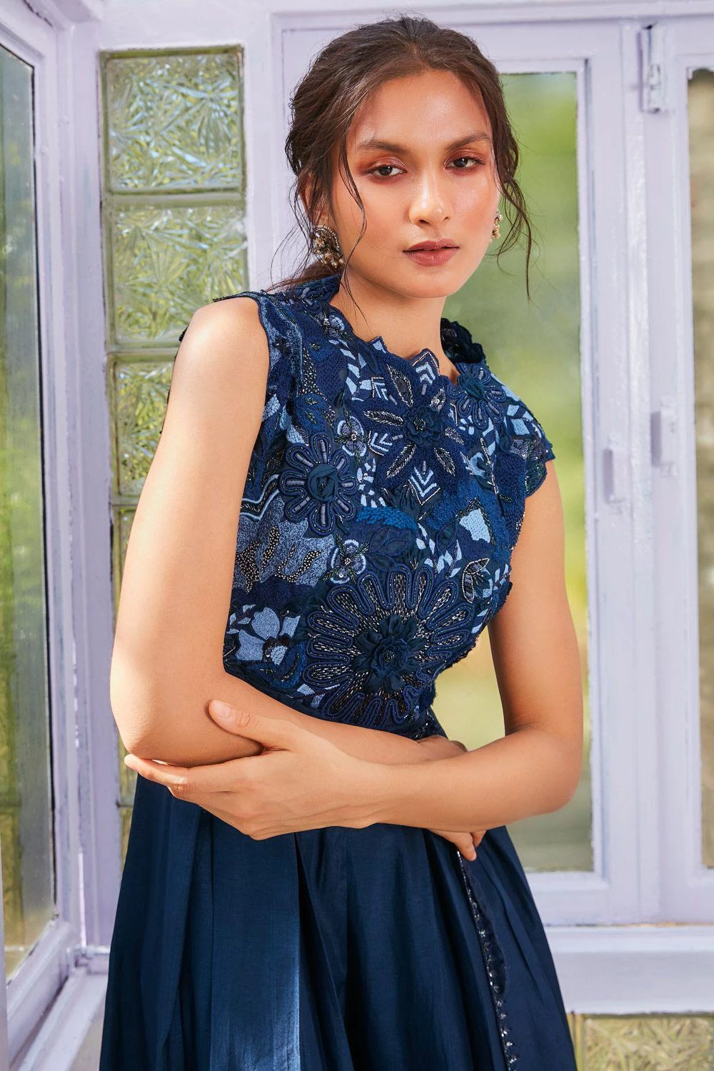 Contemporize your festive style with this vibrant jumpsuit. Cut in silk, it features an embroidered yoke with subtle lace embellishments all over. Style it with a pair of dangler earrings and a clutch to complete the look.
