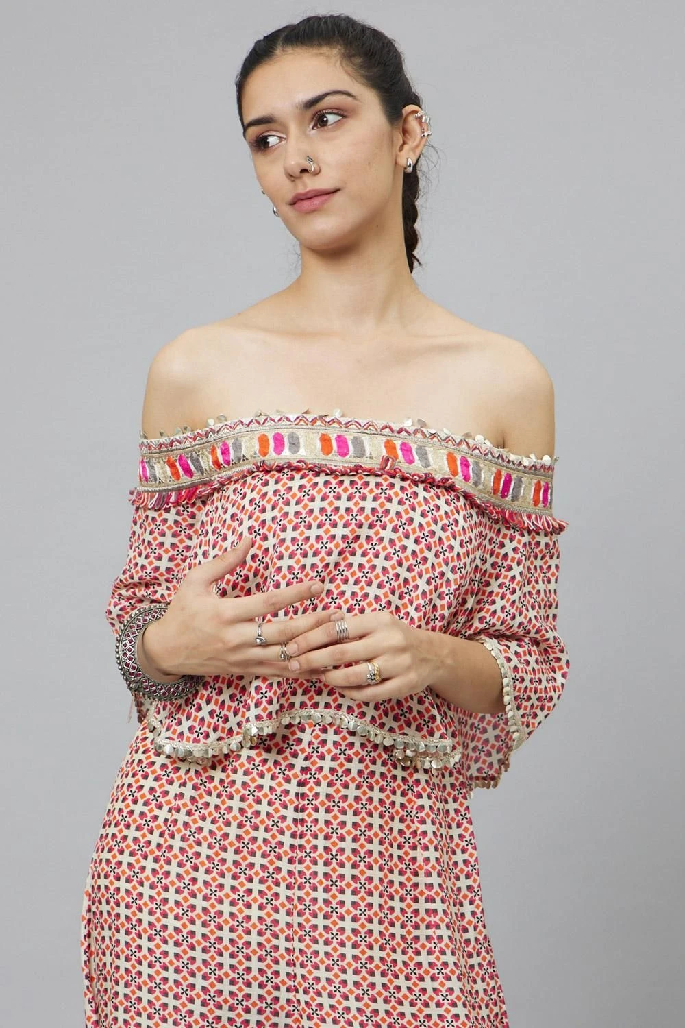 Step into the spotlight with this ivory geometric print off-shoulder jumpsuit. Its captivating design effortlessly merges fashion and artistry. The attached cape adds a touch of drama, while the off-shoulder style exudes elegance.