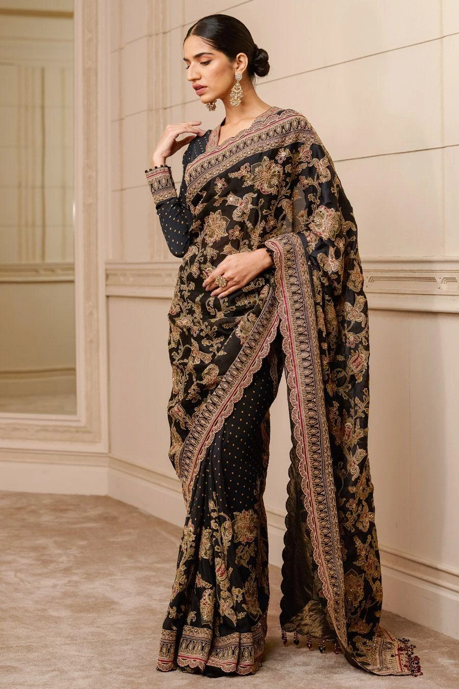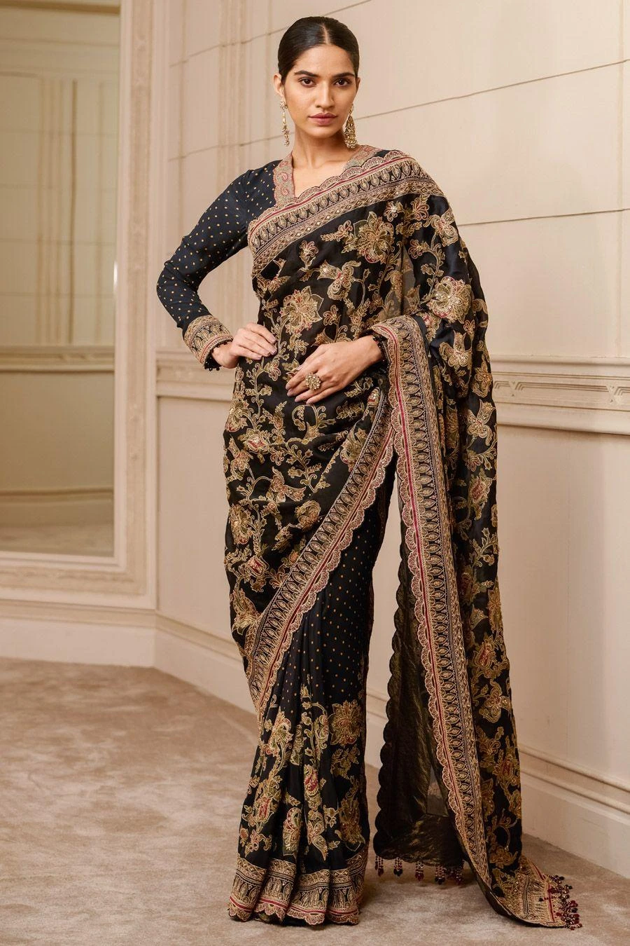 This sari in silk-crepe is designed with a satin-organza pallu with scalloped edges and is highlighted with zari threadwork and sequins. An embroidered blouse with a plunging neckline completes the ensemble.