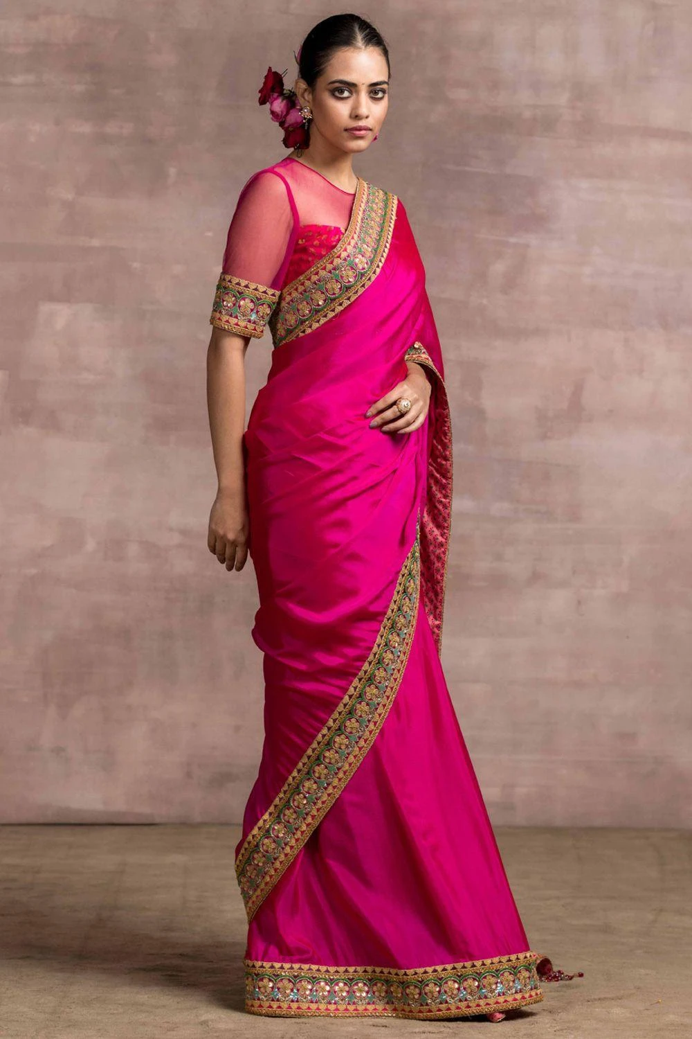 A modest & classic silhouette gets an eclectic upgrade with this hot pink sari set. The sari is made in shot silk base and adorned with a hand embroidered border & tassel detailing. It is paired with a matching fluted blouse with a sheer neckline.