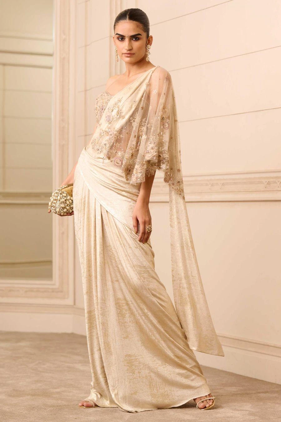 Uncomplicated & fuss-free, this pearl concept sari set is a great pick for a reception. This foil-jersey concept sari with a floral-embroidered palla is studded with crystals. It is paired with a matching floral-embroidered corset.