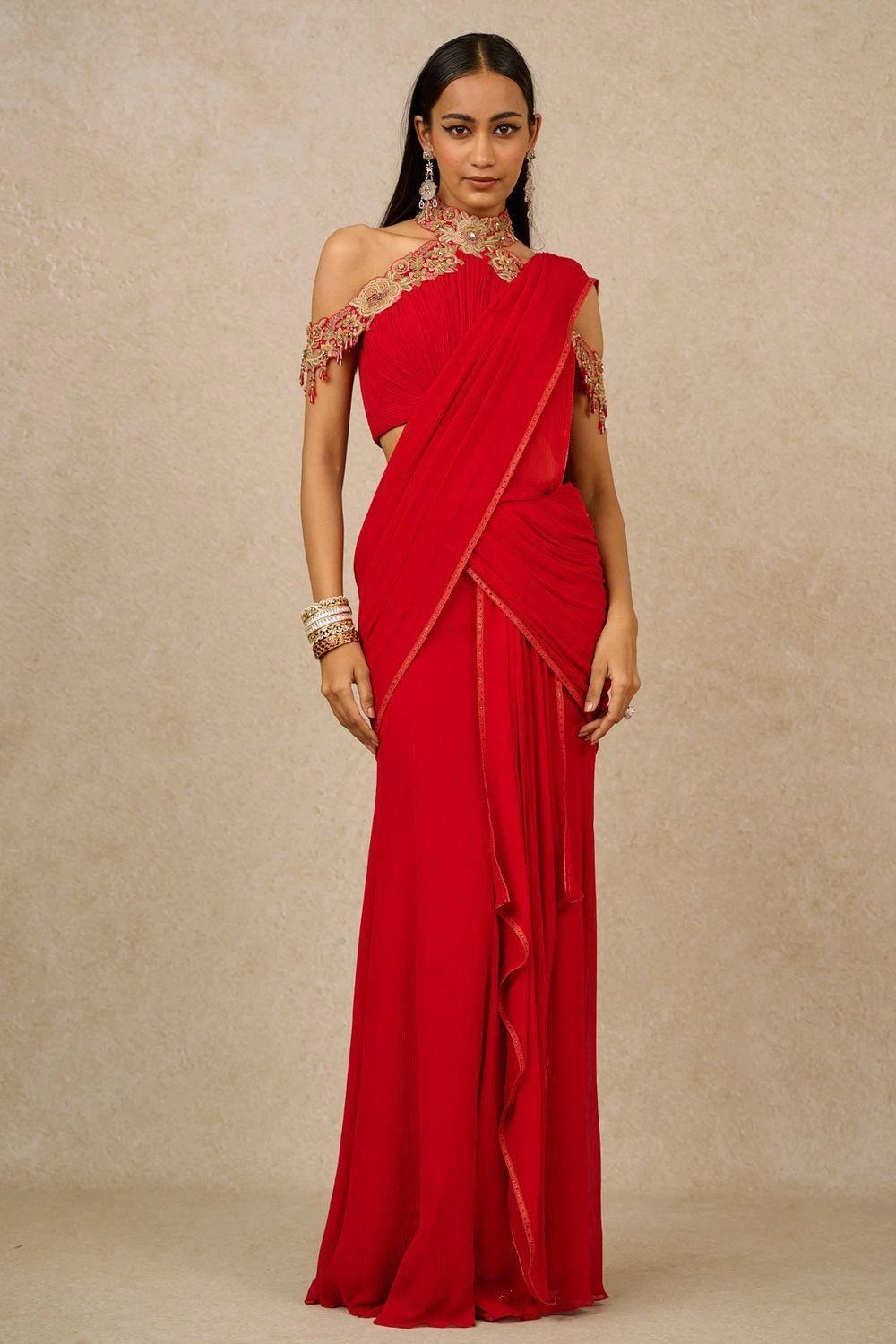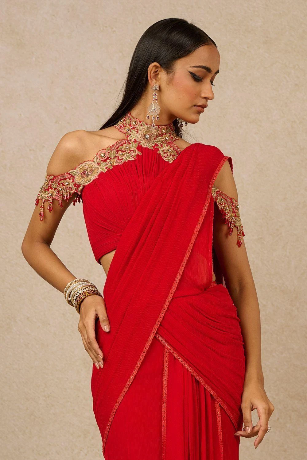 Indulge in luxury with this silk-chiffon concept sari. Paired with an exquisite fluted blouse adorned with Gara embroidery along the neckline, it’s a timeless masterpiece of sophistication and style.