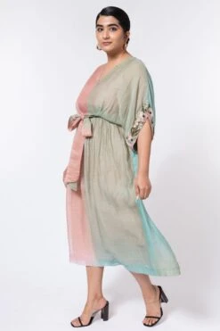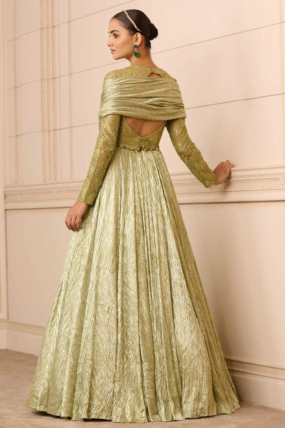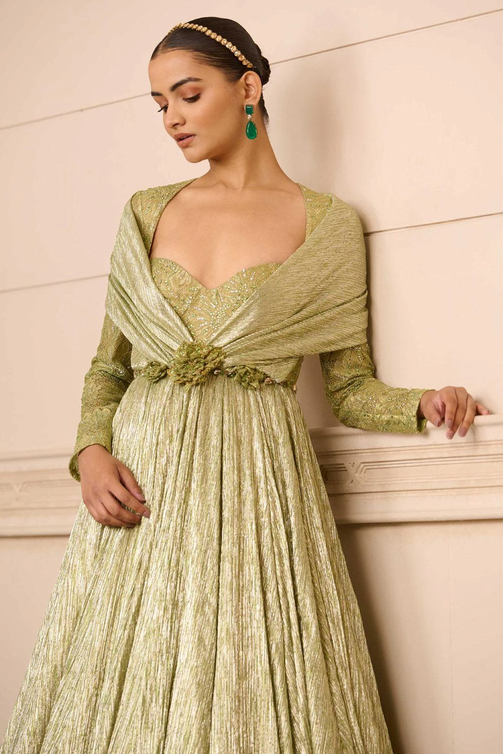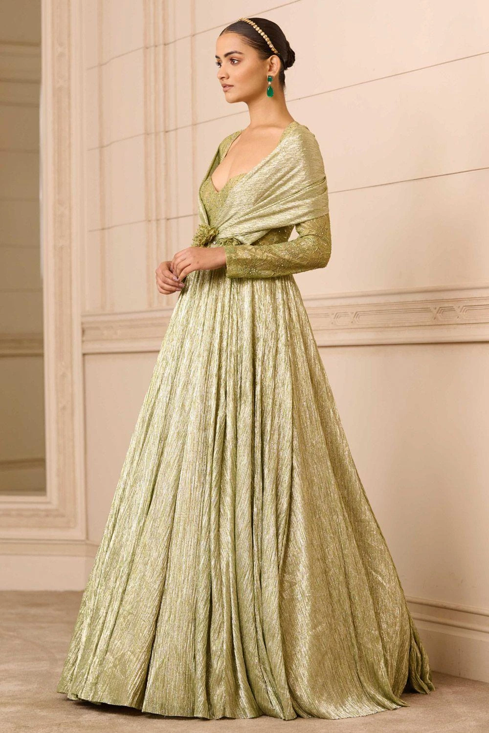 Look effortlessly stylish with this rose gold gown. This sculpted draped gown in a metallic crinkle tulle fabric is designed in a cape style. The inbuilt bodice features French lace and is accentuated with crystals on the waistline.