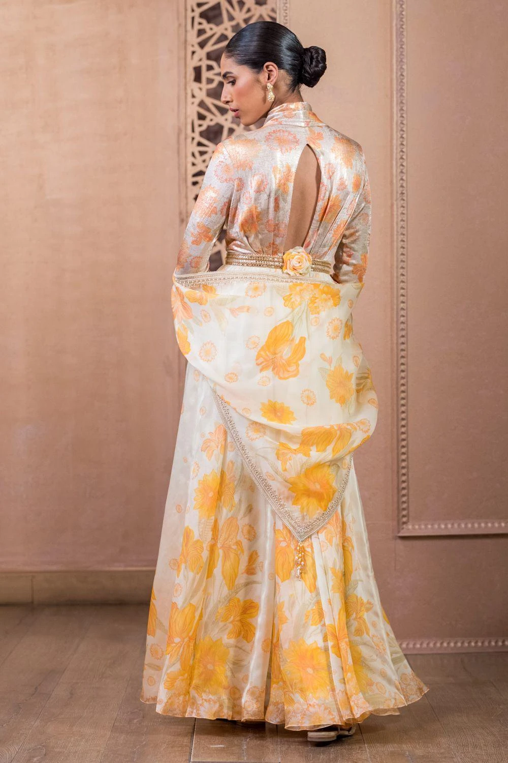 This hand-painted & printed anarkali features a plunging V-neck bodice with an embroidered border and 3D flowers on the waistline. The piece is paired with a stretch net churidar and triangular scarf that is detailed with borders and laces.