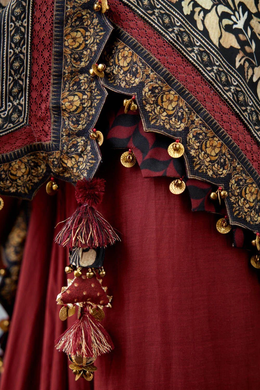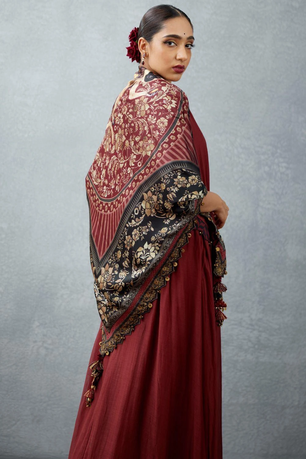 Take your layering game a notch higher with this burgundy scarf. Crafted in slub silk, this scarf features a bhagalpuri print all over finished with a leheriya border. Style it with a kurta set from the collection to complete the look.