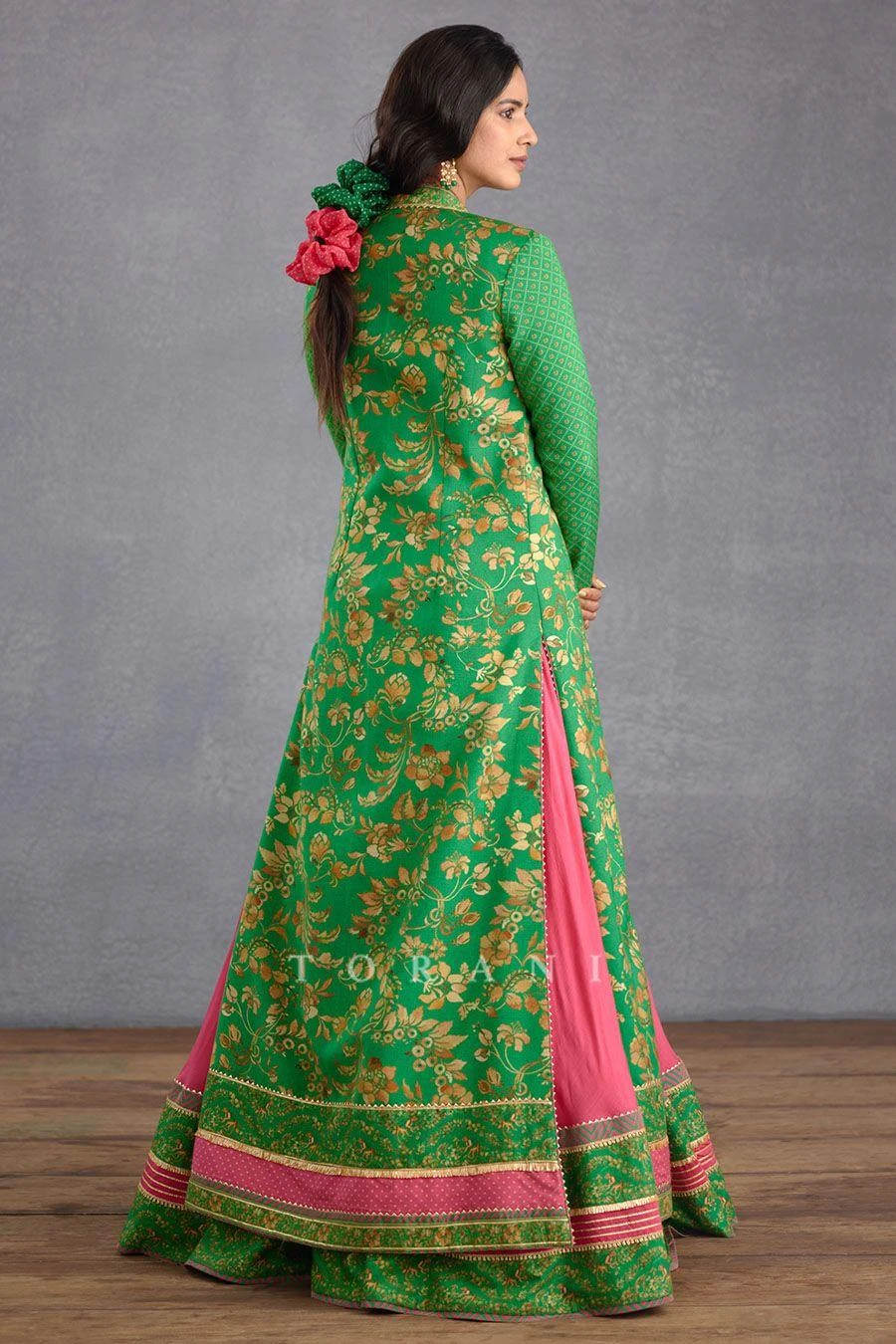 The perfect amalgamation of style & comfort, this jacket set works across occasions. Crafted in slub silk, this set features a flared embellished anarkali with a bhagalpuri printed long jacket. Add a pair of statement earrings to complete the look.