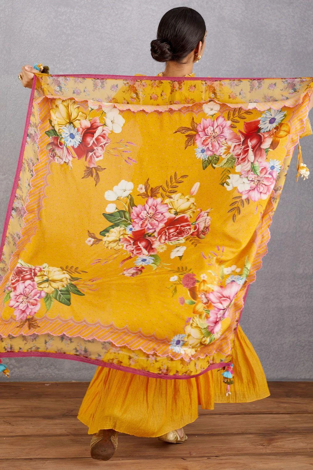 This vibrant handwoven chanderi floral printed scarf is highlighted with colourful pom pom details. Style this piece with a kurta set or dress for a playful & summery look.