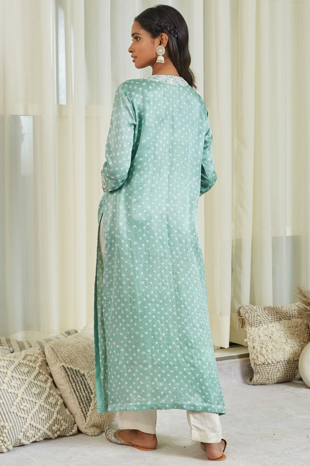 The perfect amalgamation of style & comfort, this kurta set is perfect for a day out. It features mirror embellishements with a bandhani print all over paired with straight fit pants. Style this kurta with dainty jewellery to complete the look.