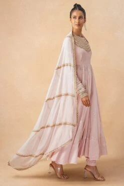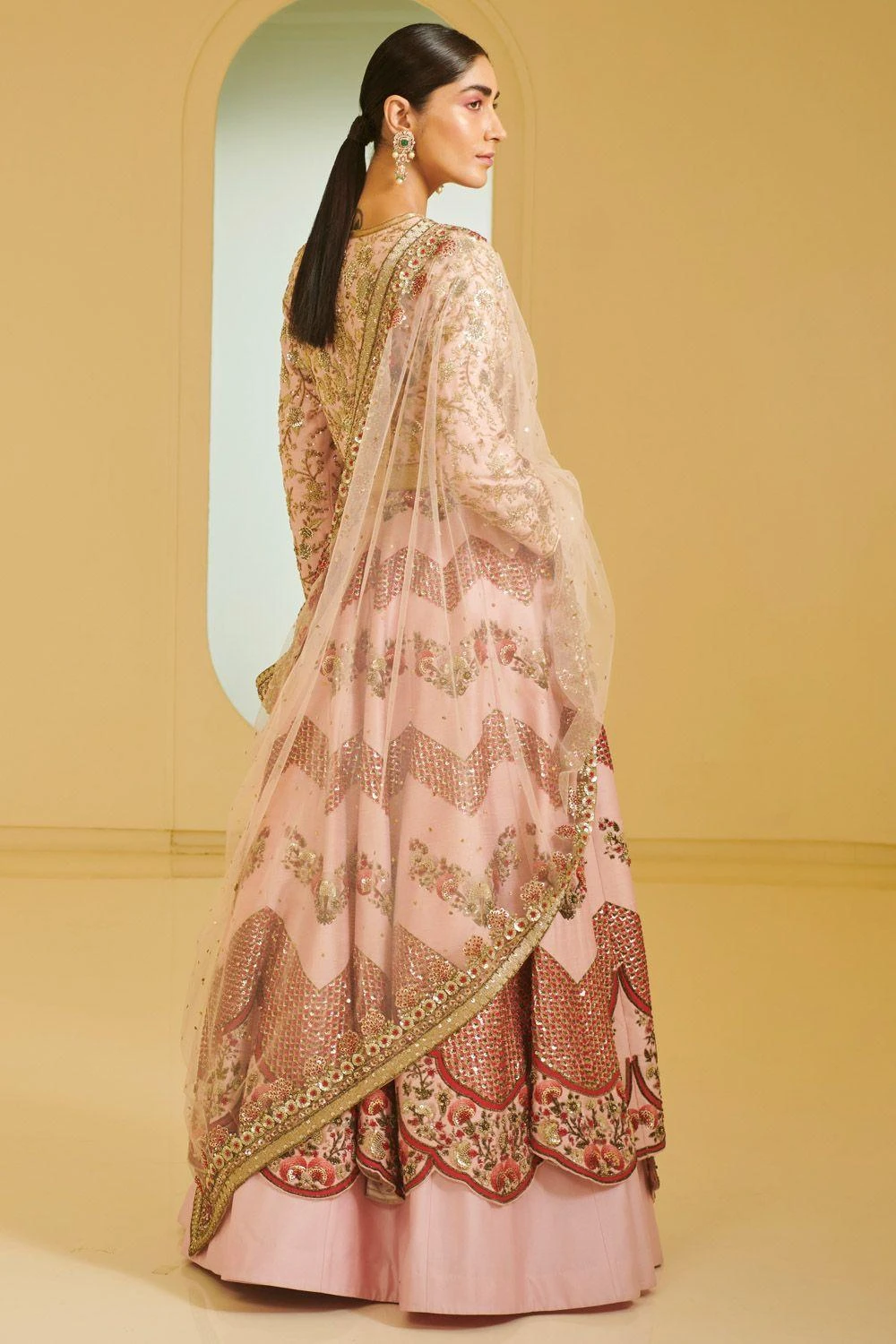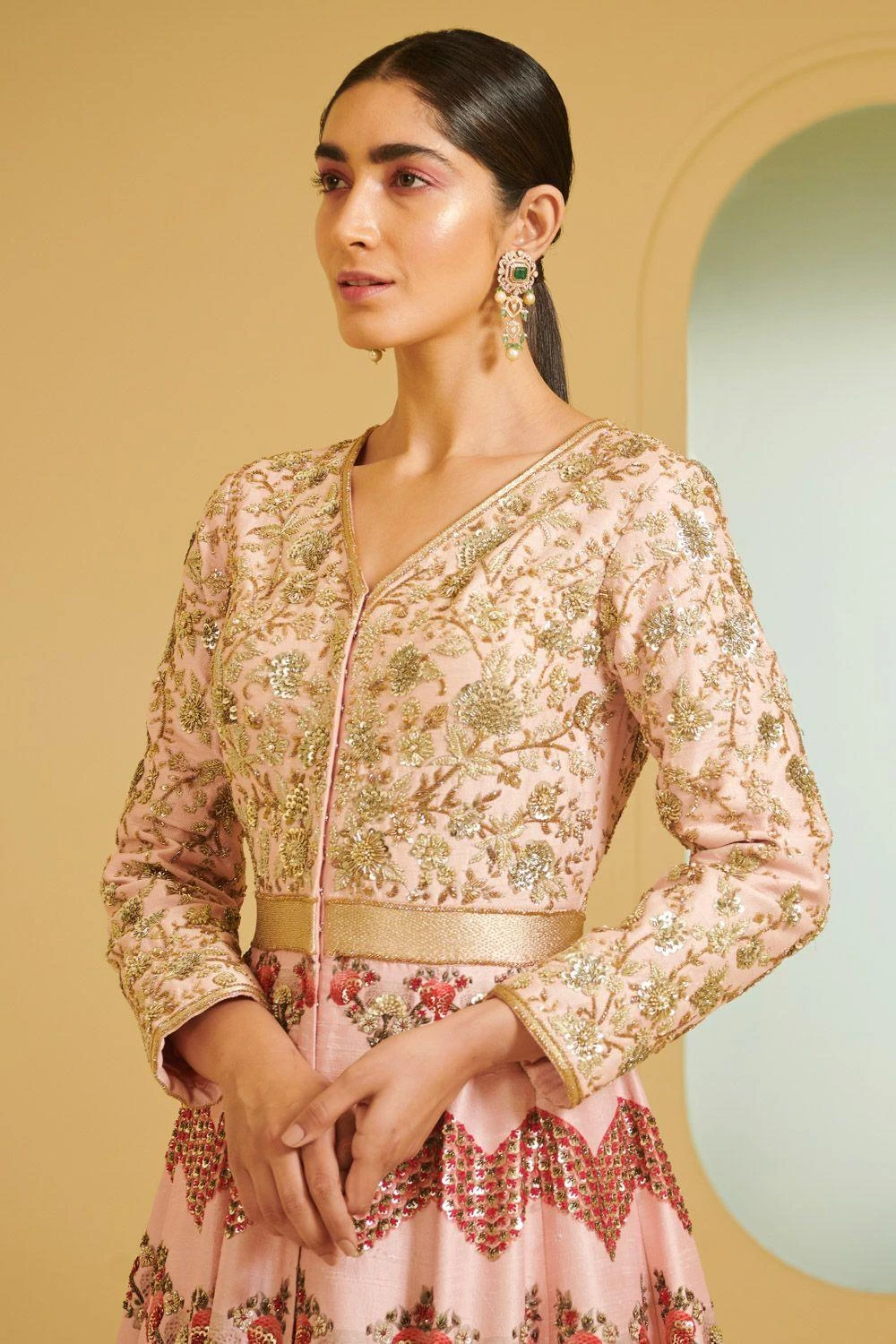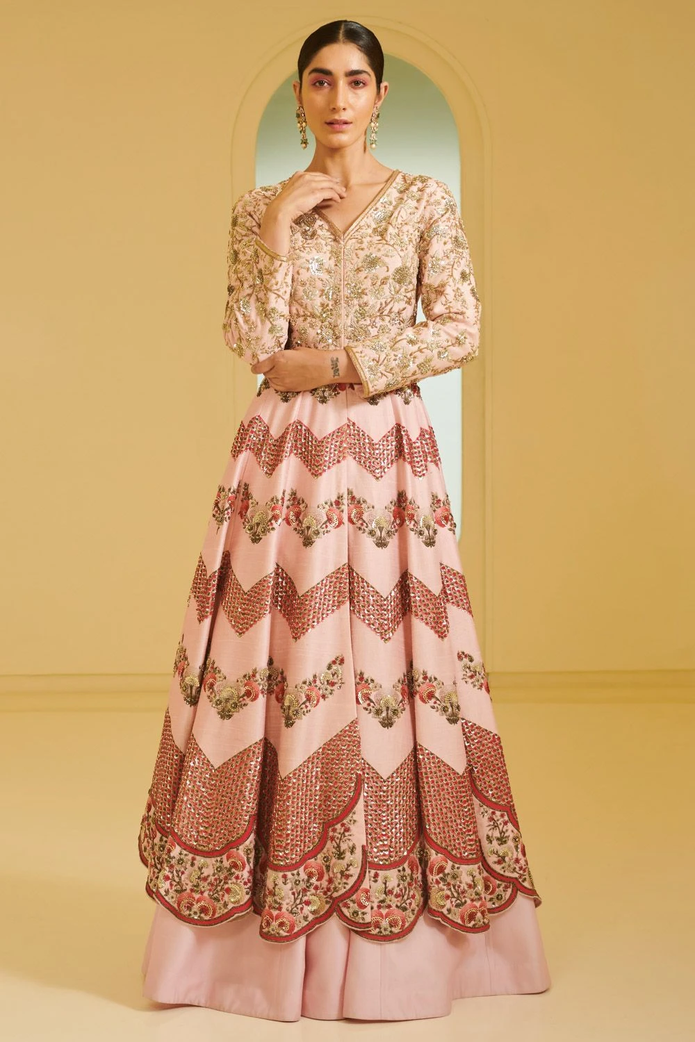 This dreamy light printed chevron anarkali is perfect for summer wedding events. This elegant piece is adorned with intricate resham thread embroidery & embellished with pearl, sequins & cutdana details.